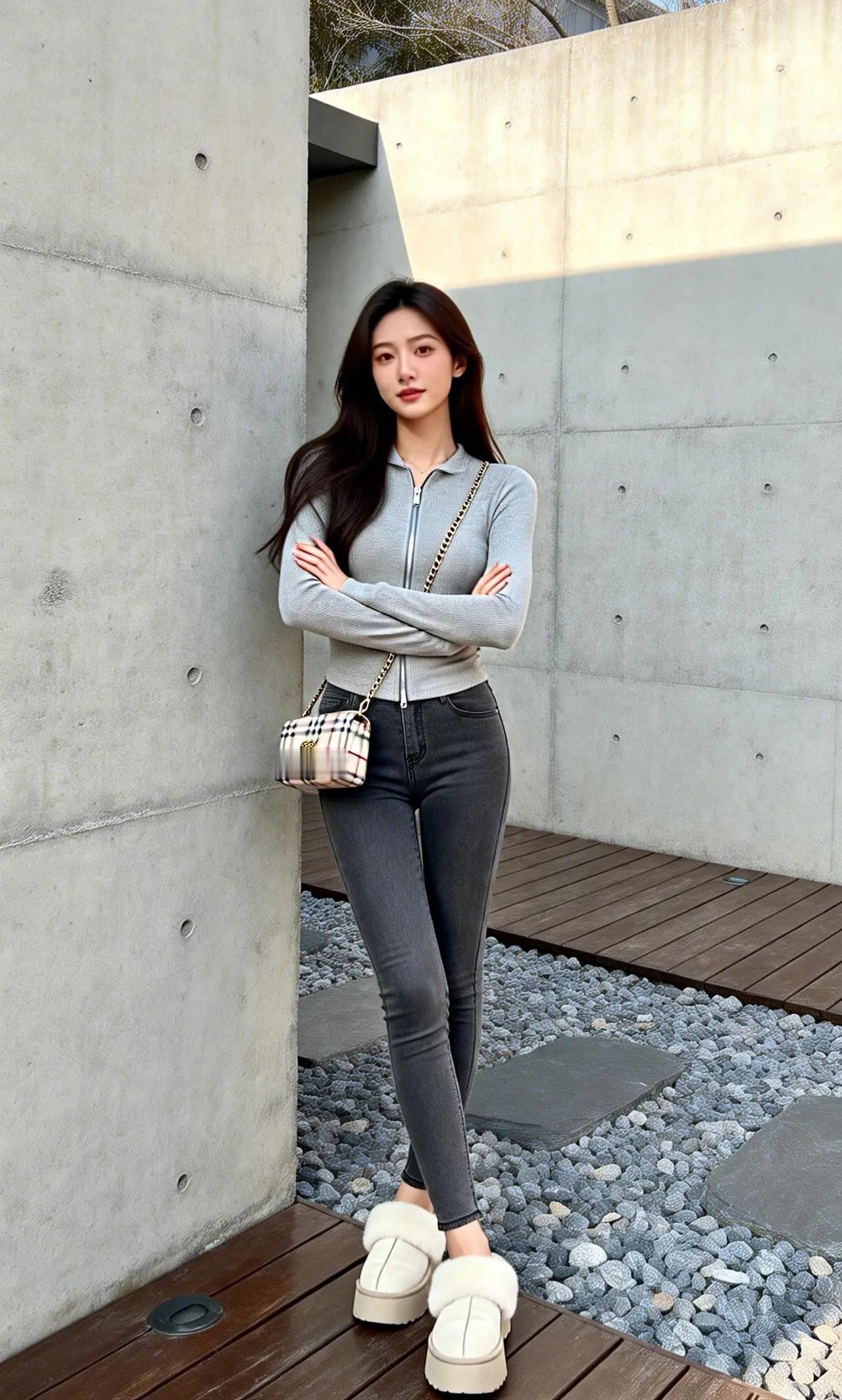 这套穿搭是清新甜美的灰调少女风,把软糯质感和灵动细节融合得很温柔。浅灰宽松针织衫