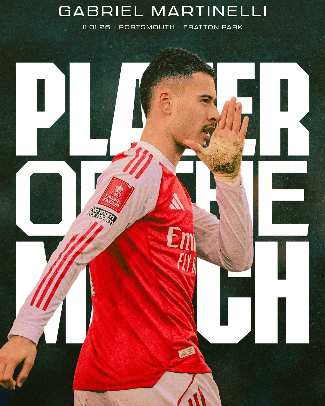 上演帽子戏法,马丁内利当选对朴茨茅斯一役枪手队内最佳