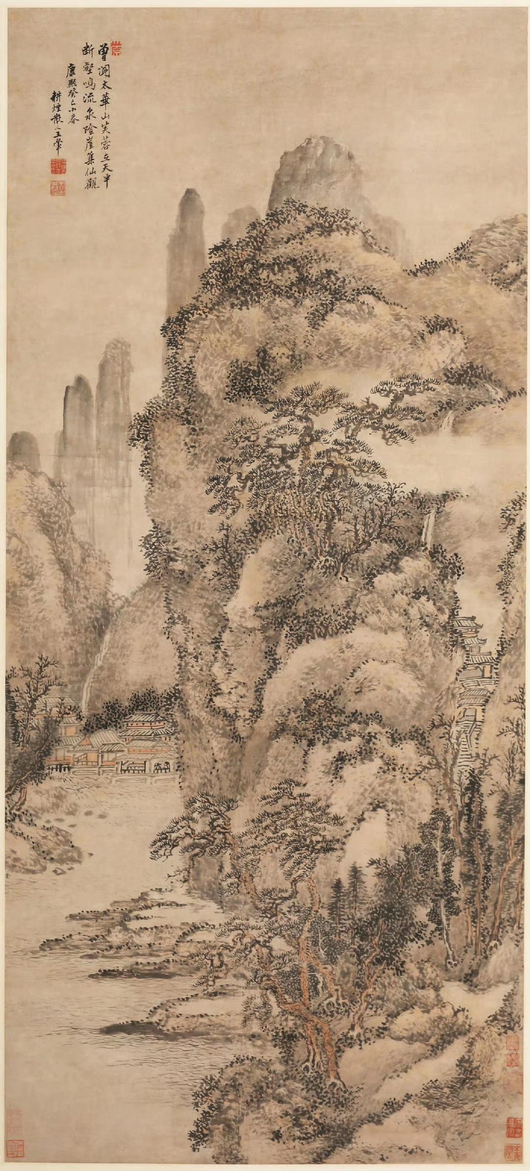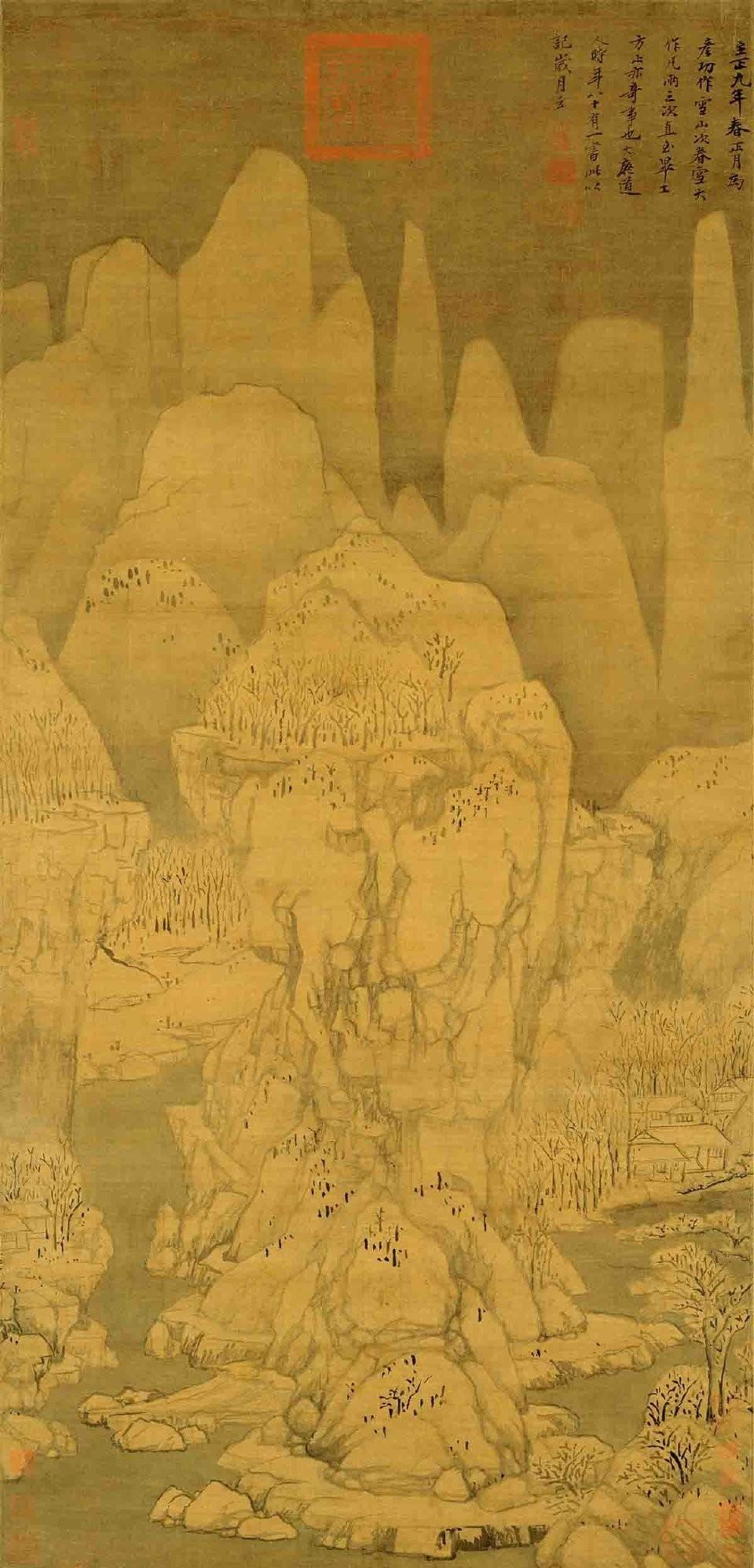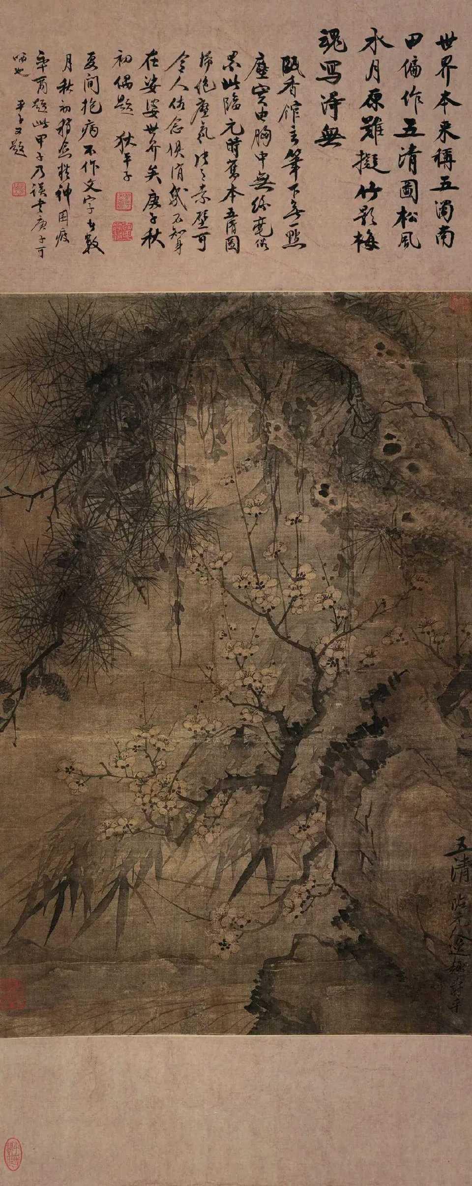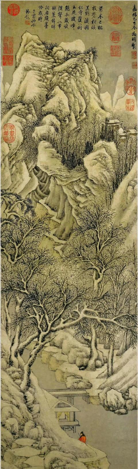 明.唐寅《骑驴归思图》。 清.王石谷《太华仙观图》。 清.张问陶《秋涧双猿图》。 宋 李唐 《万壑松风 图》。 宋代佚名《丝纶图》。 元. 黄公望 《九峰雪霁图》。 北宋. 燕肃 《关山积雪图》。 恽寿平《五清图》立轴 。 王翚《唐寅诗意图》。
