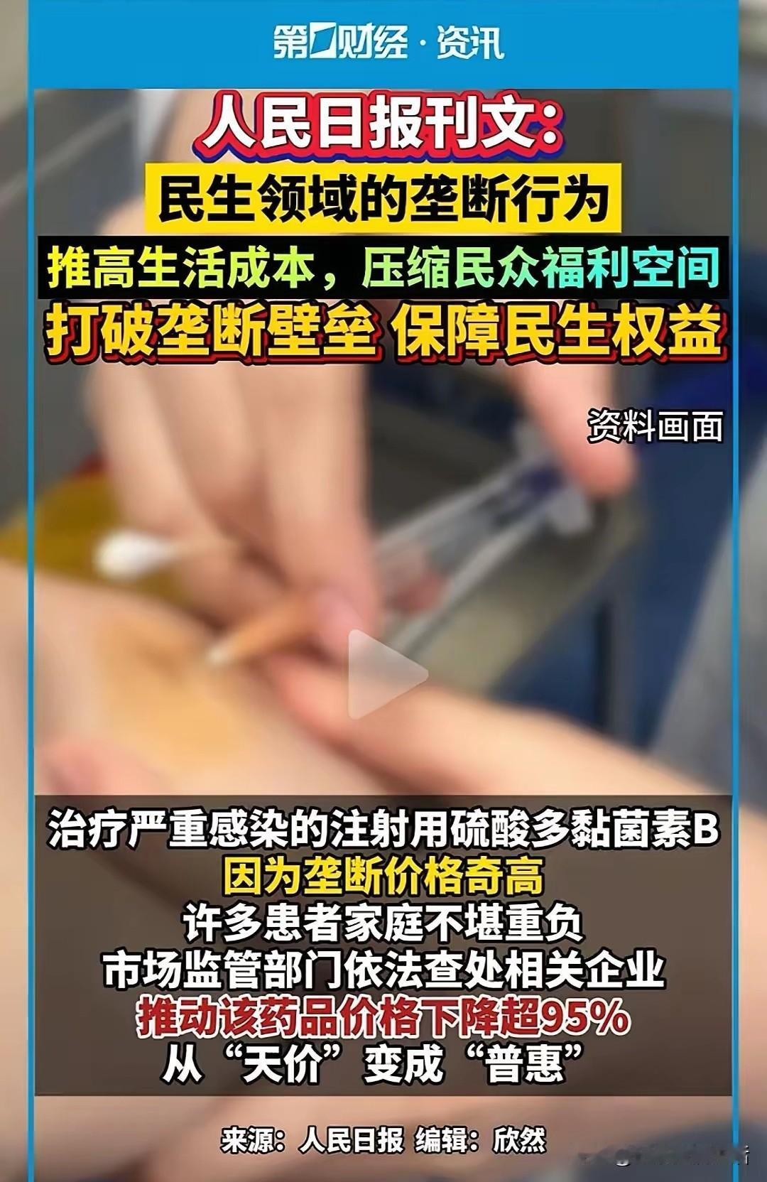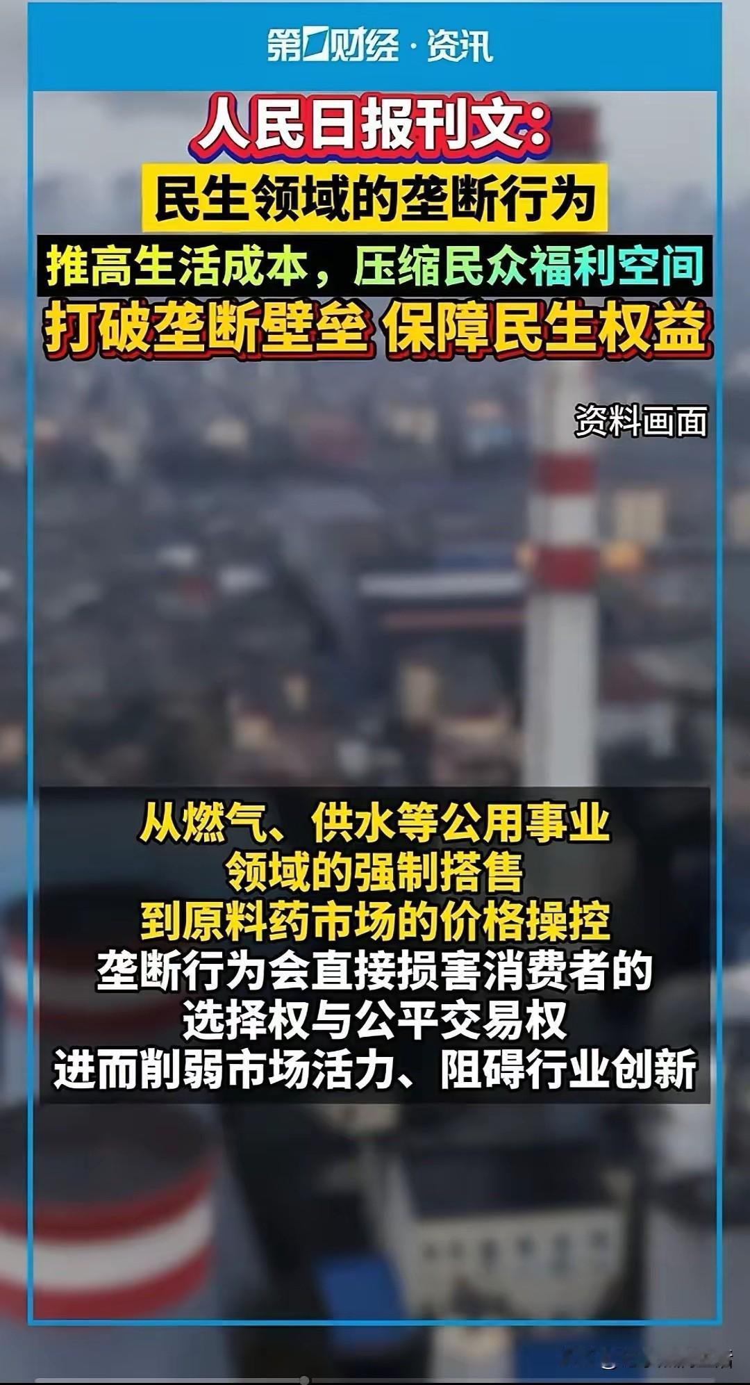 《人民日报》刊文带你了解为什么大家不敢花钱了,就是因为各种垄断,有些还是隐形的垄断。 现在有人发现了这个问题,也提出了这个问题,剩下的就是解决这个问题的人了。 《人民日报》迈出了打破垄断壁垒的第一步,唤醒人民的消费认知,并且提出可行性意见。 目前供水、供电、燃气基本上还都掌握在国企手里,居然还有人要提出来让资本运作这些民生工程,说的是非常道貌岸然,说什么为了降低成本,提高效率。 如果真的被资本控制了民生,老百姓的生活只会更苦、更难,甚至说是更活不起,也死不起了。 河北某地的冬天,是那些孤寡老人们最难熬的季节,很多人可能都看不到来年的春天。 为了保护xx的碧水蓝天,他们主动响应号召,拆掉了烧了几十年的柴火锅,改成燃气灶,平时烧火做饭的费用还能靠低保或者退休金勉强接受。 但是冬天取暖的费用对于他们来说,却高的吓人,全年的经济收入,可能都不够一个冬天的取暖费,即使是儿女给装上空调,高额的电费,对于节俭了一辈子的老人,也是如挖心头肉。 最后迫不得已,只能通过最原始的加棉被,来勉强度日,白天室内温度甚至比室外都低。 还有医疗更是老百姓最头疼的事,平时根本不敢生病,就算生病了,也最多买点药扛一扛,医院不到万不得已,肯定是不敢去的。 如果能把这些东西全部变成普惠性的,去医院看病就像去菜市场买菜一样从容,老百姓又怎么会在家硬挨呢。 我们的老百姓不怕吃苦受累,只怕自己没钱消费,幸福生活,必须从打破垄断开始!