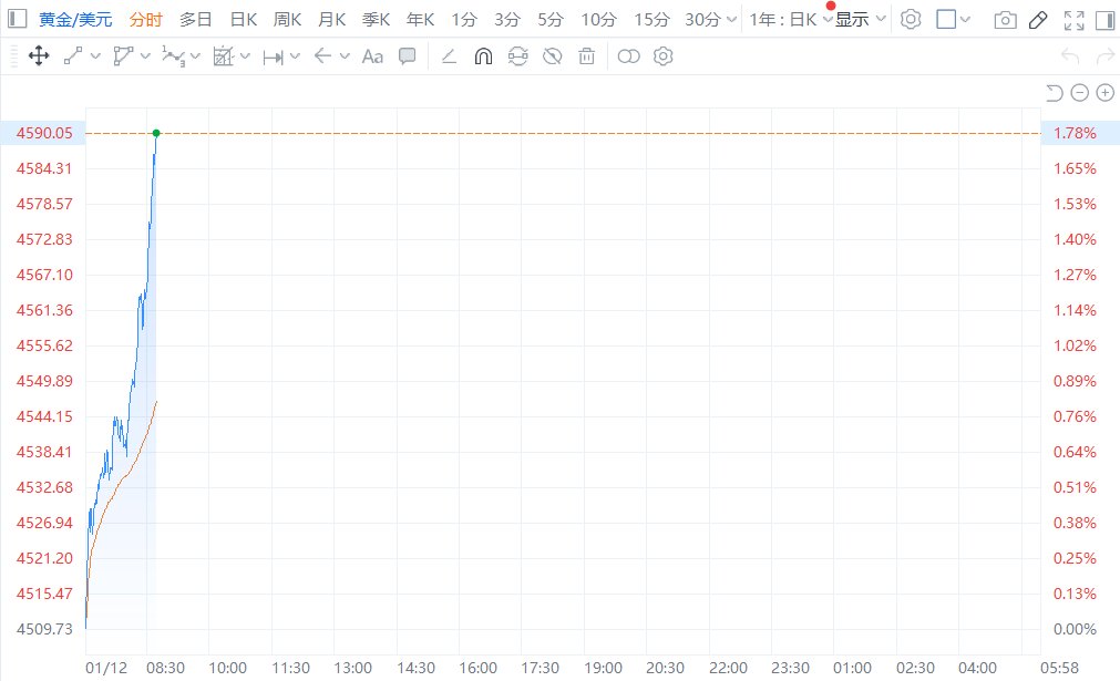 格隆汇1月12日|现货黄金涨势如虹,现已突破4590美元/盎司,涨幅约1.8%,续创历史新高;今日早盘,现货黄金已接连突破4550美元、4560美元、4570美元、4580美元等多道关口。纽约期金首次突破4600美元/盎司大关,上涨2.2%。