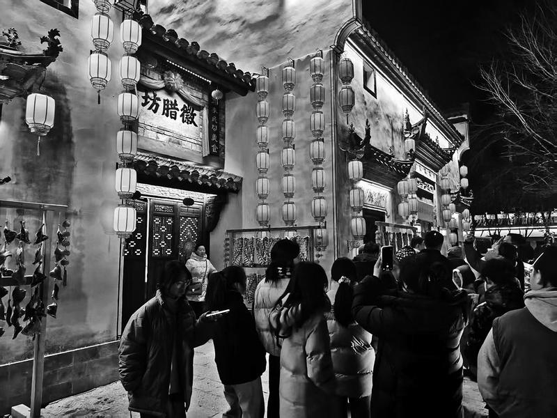 跟着拥挤的人流步入位于卫食园厂区北侧的“文友小院”,徽派建筑的古朴韵味扑面而来。飞檐翘角下红灯笼高悬,灯光与水中倒影交相辉映,与岸边错落的马头墙构成了一幅美丽的水墨画卷。“确实有宏村那味儿,不用跑远就能感受到徽派风情。”正在拍照的市民张女士兴奋地表示,她已在朋友圈发布了九宫格,引来不少朋友询问地址。