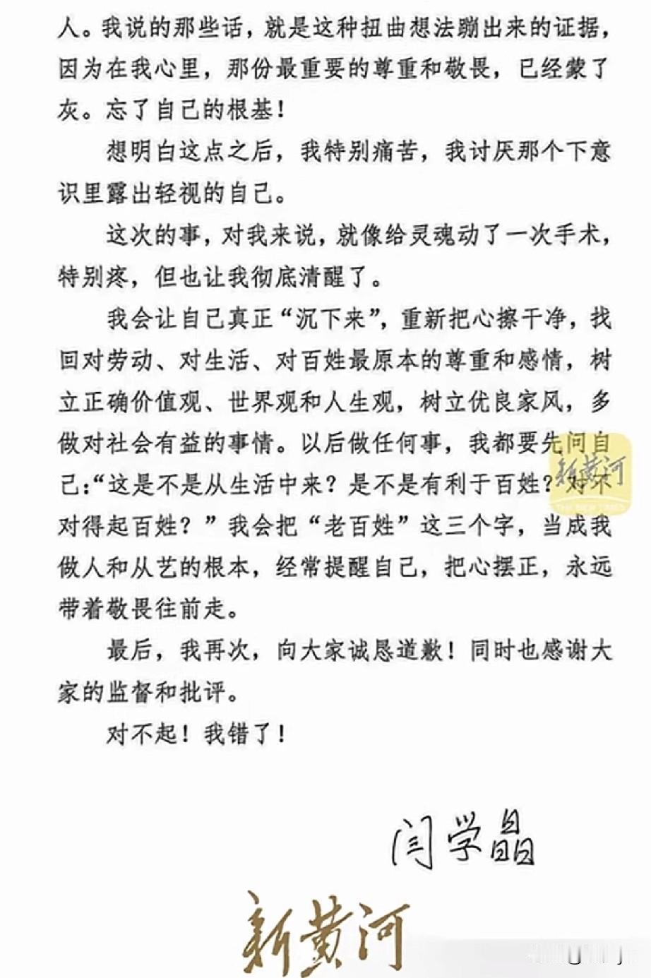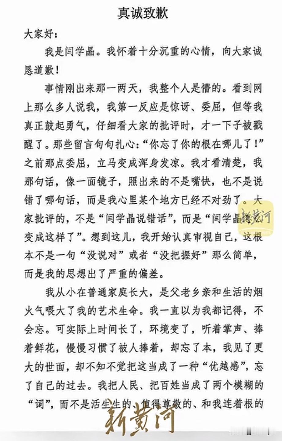 演员闫学晶道歉!1月11日,有媒体发表闫学晶《真诚致歉》信。信中,闫学晶承认自己“根本不是一句‘没说对’或者‘没把握好’那么简单,而是我的思想出现严重的偏差”,是忘了根在哪里,忘本了! 这份道歉还算深刻,但愿不是外界压力所至,而是内心真诚反省,但愿像信里所说的那样,痛定思痛,痛改前非,好好做人,真心求得谅解,哪怕还有人不原谅! 还得记着,咱就是老百姓,就是普通一人,真正回归本真! 阎学晶 闫学晶演唱会 编剧阎学晶 跨界女王闫学晶
