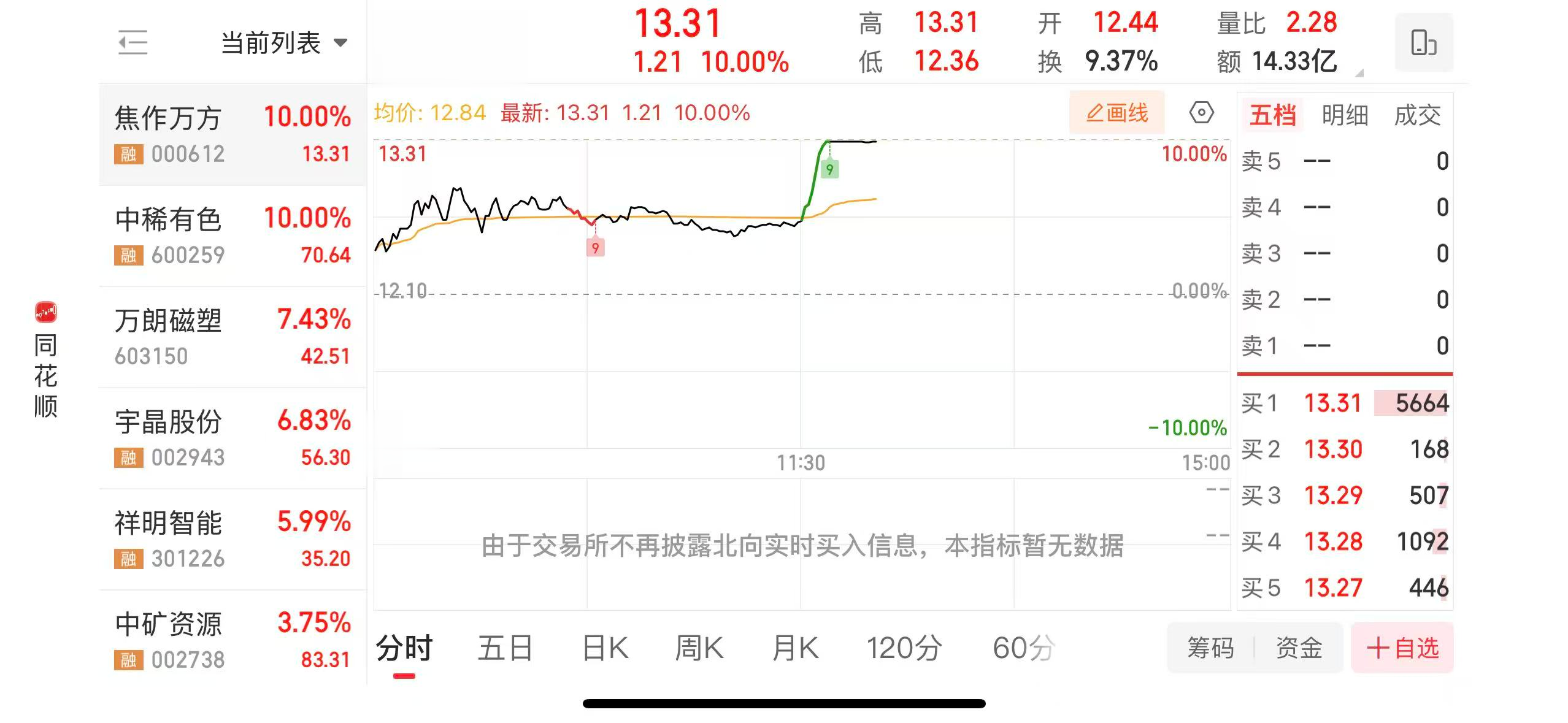 1月12日,稀土永磁板块延续上周强势,午后焦作万方(000612.SZ)涨停,中稀有色(600259.SH)、万朗磁塑(603150.SH)、中国稀土(000831.SZ)、宇晶股份(002943.SZ)、北方稀土(600111.SH)、盛和资源(600392.SH)等跟涨。