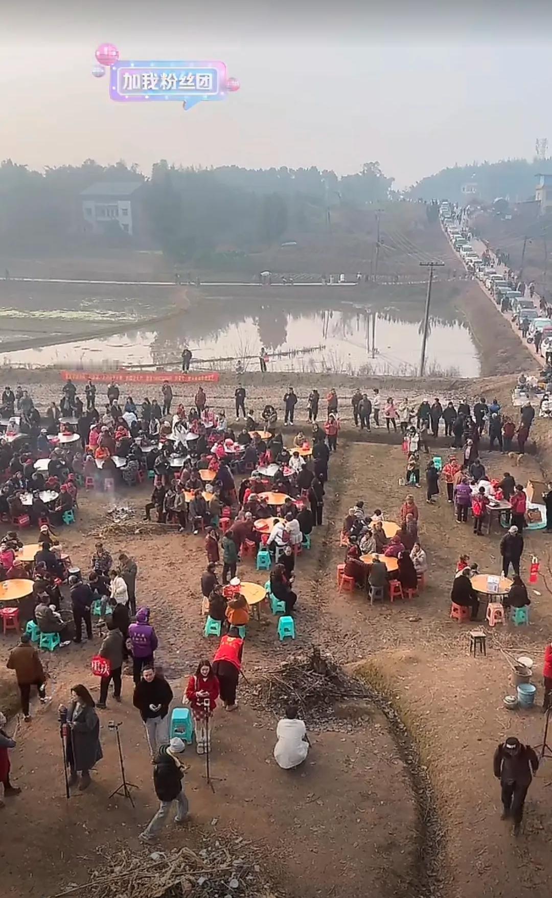 事情搞大了,已经出动了帽子叔叔、政府部门、文旅工作人员等。现场来了几千人,车停满了几公里,线上一直 10 万+在线,直播间礼物漫天飞,这泼天的富贵在合川文旅的帮助下被接住了。 播主呆呆仅凭一己之力,发了一条杀年猪需要人帮忙的视频,已经在网络引起轩然大波,全抖音都是杀年猪这件事。别人梦寐以求的 10 万+被她一个人轻松拿捏,而且一直保持着居高不下,粉丝从开始的几百人,用不到两天的时间已经涨到了40 万。 原本呆呆家只准备了2头年猪,哪架得住几千人捧场,好在热心网友送了1头,合川文旅连夜补了2头,5头猪才撑起了这场流水席。现场网友一点不生分,自发分成烧火、切菜、端碗的队伍,荣昌的“卤鹅哥”还特意拉来招牌卤鹅加菜,院子里300桌轮换着开席,蹲在路边端碗吃的人都笑得开心。 合川文旅没浪费热度,工作人员穿着红马甲当向导,现场发钓鱼城景区门票和合川桃片,官方账号一天连发9条视频,把杀猪宴和本地景点、特产绑着推。这波操作让相关话题全网播放量冲到8000万,连澳大利亚的华人都刷到了,知道了合川的年味和历史。 流量还带火了周边经济,云门街道的酒店订单暴涨300%,不少农家乐直接推出“体验版刨猪汤”,游客能亲手参与按猪、煮肉。村里的土鸡蛋、红薯粉被抢购一空,有农户半天就卖了近3万元,实实在在尝到了流量的甜头。 这场狂欢的核心是真实与温暖。呆呆的随口求助戳中了都市人对年味的向往,合川文旅的快速补位让混乱变成有序,陌生人的自发帮忙让网络热络落地成真情。流量来得偶然,但接住它的关键,是对普通人情感的尊重和对本地资源的灵活转化。