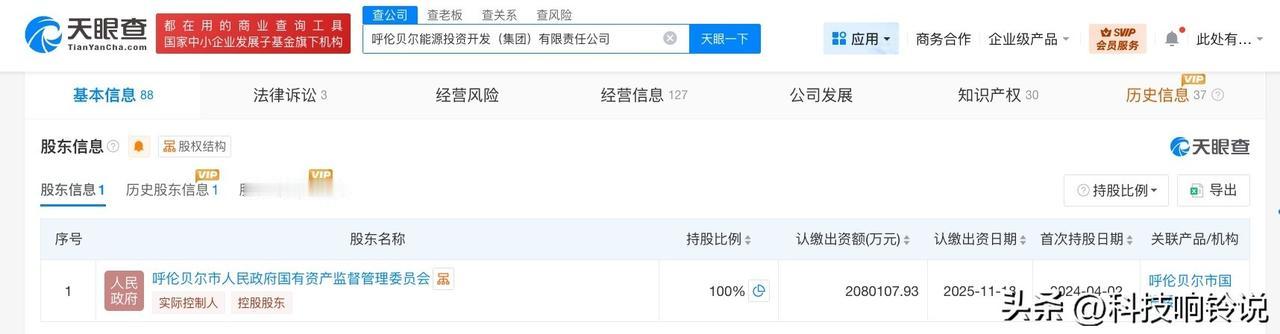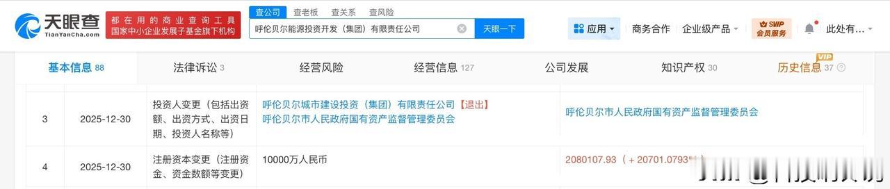 【呼伦贝尔能源投资开发集团增资至208亿 增幅约20701%】 天眼查工商信息显示,近日,呼伦贝尔能源投资开发(集团)有限责任公司发生工商变更,呼伦贝尔城市建设投资(集团)有限责任公司退出股东行列,同时,注册资本由1亿人民币增至约208亿人民币,增幅约20701%。 呼伦贝尔能源投资开发(集团)有限责任公司成立于2019年1月,法定代表人为徐向泽,经营范围含自有资金投资的资产管理服务、电力行业高效节能技术研发、电力设施器材制造、石油制品销售、工程技术服务、企业管理咨询、招投标代理服务、风力发电技术服务、太阳能发电技术服务等。股东信息显示,该公司现由呼伦贝尔市人民政府国有资产监督管理委员会全资持股。 天眼查信息: