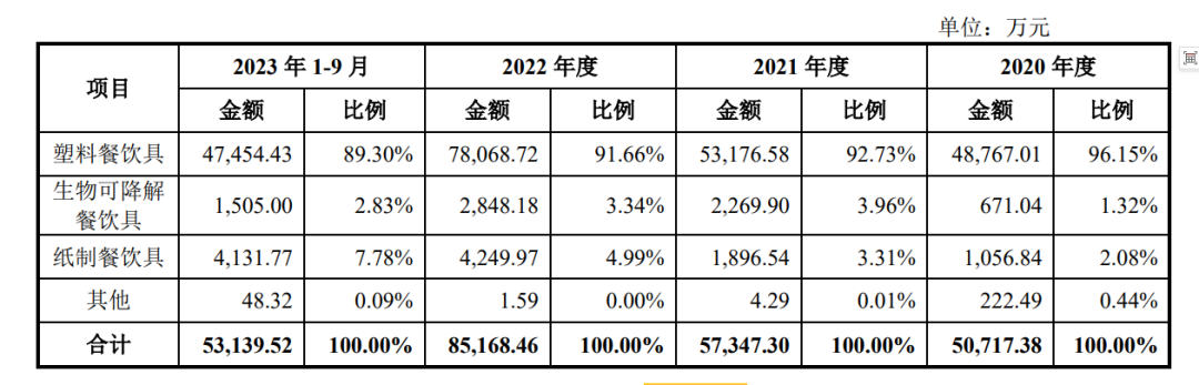 而昌亚股份的产品结构单一,业绩高度依赖塑料制品,产品也以PP、PS等塑胶原料为主。2020年、2021年、2022年及2023年前三季度,该公司约有9成的营收来自塑料餐饮具,而在生物可降解餐饮具上的布局显得迟缓,营收占比分别为1.32%、3.96%、3.34%、2.83%。