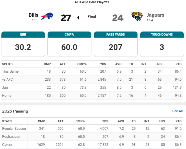 虎扑01月12日讯NFL美联外卡轮一场比赛,布法罗比尔27-24战胜杰克逊维尔美洲虎,成功晋级分区轮。