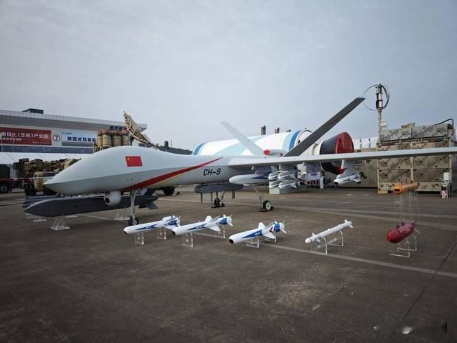 - 9:中国空军中高空长航时的“察打巨擘” 彩虹 - 9是中国现役空军中一款极具实力的中高空长航时察打一体无人机,由航天彩虹无人机股份有限公司精心打造。它身形庞大,机身长 12 米,翼展达 24.8 - 25 米,最大起飞重量 5000 千克。 其性能堪称卓越,最大滞空时间长达 40 小时,最大航程超 11500 千米,升限 11000 米,可轻松避开多数低空防空火力。它拥有 9 个挂架,能灵活挂载 AR 系列导弹、鹰击 - 21 高超音速导弹等,打击能力强大。 完善的航电系统赋予它侦察监视、作战支援等多任务能力。模块化设计使其能快速切换角色,智能化自主飞行能力更让它成为空军战略支撑的得力“干将”。