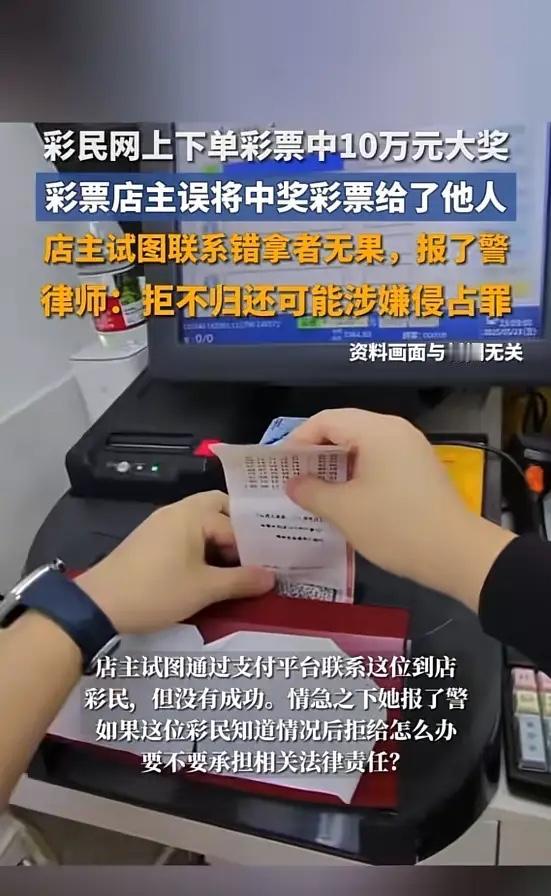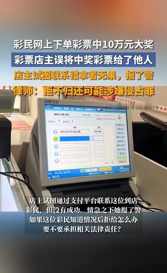 “这便宜不能占!”1月4日,江苏扬州,一彩票店老板因一时疏忽,将顾客在网上买的彩票误给了到店的一名男子,结果没想到,这张彩票竟中了10万!因为联系不上男子,老板只能先垫付奖金,并报警寻找该男子。网友:这也太粗心了! 事情发生在扬州一家彩票店,1月4日晚上7点多,店主朱小姐正忙着看手机,一位老顾客通过微信请她代买几张彩票。她像往常一样,熟练地打印出顾客选定的号码。可这回她没留意,打好的彩票还夹在打印机上,没及时收起来。 这时候一位男顾客走进店里要买彩票,朱小姐一边招呼着,一边操作机器。也许是晚上有些疲惫,她顺手将刚才打印好的那几张彩票,连同新打的几张,一并撕下来递了过去。她完全没意识到,这里面夹带着微信顾客早已付款预订的彩票。 当晚开奖结果出来,朱小姐的微信就响个不停。那位线上顾客急切地询问自己的彩票,说其中好像有中奖的。朱小姐心里咯噔一下,赶紧在柜台上下翻找,却怎么也找不到那张彩票。她调出店里的监控录像,一帧一帧地回放,画面清晰显示,她确实不小心把那张彩票混着交给了后来到店的男顾客。再一核对号码,这张被错给的彩票竟然中了10万元大奖。 朱小姐立刻尝试通过支付平台联系那位男顾客,消息却石沉大海。面对线上顾客的焦急等待,她心里很不是滋味。错误是自己造成的,就得承担责任。尽管还没联系上男顾客,也没拿到中奖彩票,朱小姐还是自己先掏腰包,垫付了10万元奖金给那位微信顾客。对她来说,这家小店能开下去,全靠街坊邻居的信任。她说:“钱没了可以再赚,信誉丢了生意就做不下去了。” 处理完赔偿后,朱小姐选择了报警,希望警方能帮忙找到那位男顾客,妥善处理这张中奖彩票。她表示,如果那位先生愿意归还彩票,她会真诚感谢。她也理解,对方可能至今还不知道自己手里有张中奖彩票。 这种“线上预订,线下出票”的购彩方式现在挺普遍,但偶尔就会引发这类纠纷。购彩者无法即时拿到并核对实体票,店主的工作细心程度就显得尤为关键。一旦出了差错,就像这次,即使中奖,喜悦也变成了折腾。 很多网友佩服店主敢于担当,先垫付奖金是诚信之举。也有网友提醒,无论买彩票还是做小生意,细节真的马虎不得,一个小小的疏忽可能就会带来大麻烦。 朱小姐的彩票店还照常营业,她说经过这次教训,自己定了新规矩:只要接到线上订单,打出彩票后立刻拍照发过去确认,并且单独收好,再也不能混在一起。她还在店里贴了温馨提示,请顾客买完彩票后当场核对,离柜后就很难负责了。 各位读者你们怎么看?欢迎在评论区讨论。