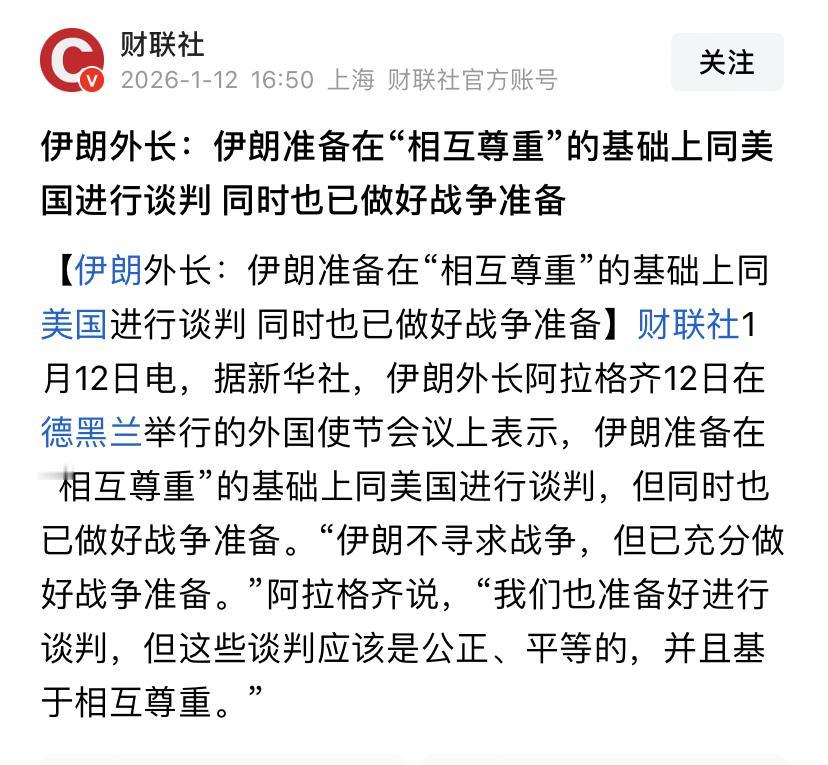 伊朗要和美国谈判[灵光一闪] 伊朗外长公开了这个表态,同时强调谈判的条件是互相尊重和平等。他的这个表态更早些时候通过阿曼私下传达给了特朗普,但是特朗普还在考虑打一下。 因为伊朗政府其实控制不了革命卫队,而革命卫队是目前伊朗乱局的关键。假如美国和伊朗一边谈,革命卫队一边施暴,这会让特朗普很没面子。同时,革命卫队等强硬派甚至可能骂伊朗外长对美国投降。 因此未来伊朗的局势,不会因为伊朗外长要和美国谈谈而彻底改善。