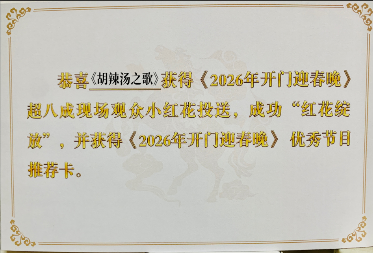 1月11日,央视《2026年开门迎春晚》节目最新一期,河南鹤壁的东河乐队与秦梦瑶、歌手恰恰联袂登场,演绎了一首令全场惊艳的《胡辣汤之歌》,该作品将河南方言、豫剧、英文巧妙融合,引发广泛关注。1月12日,东河乐队主唱魏子璠告诉大河报《看见》记者,受邀出演该节目的作品,有机会登上春晚舞台。魏子璠称,《胡辣汤之歌》获得现场超八成观众的小红花投送,成功“红花绽放”,已拿到优秀节目推荐卡。