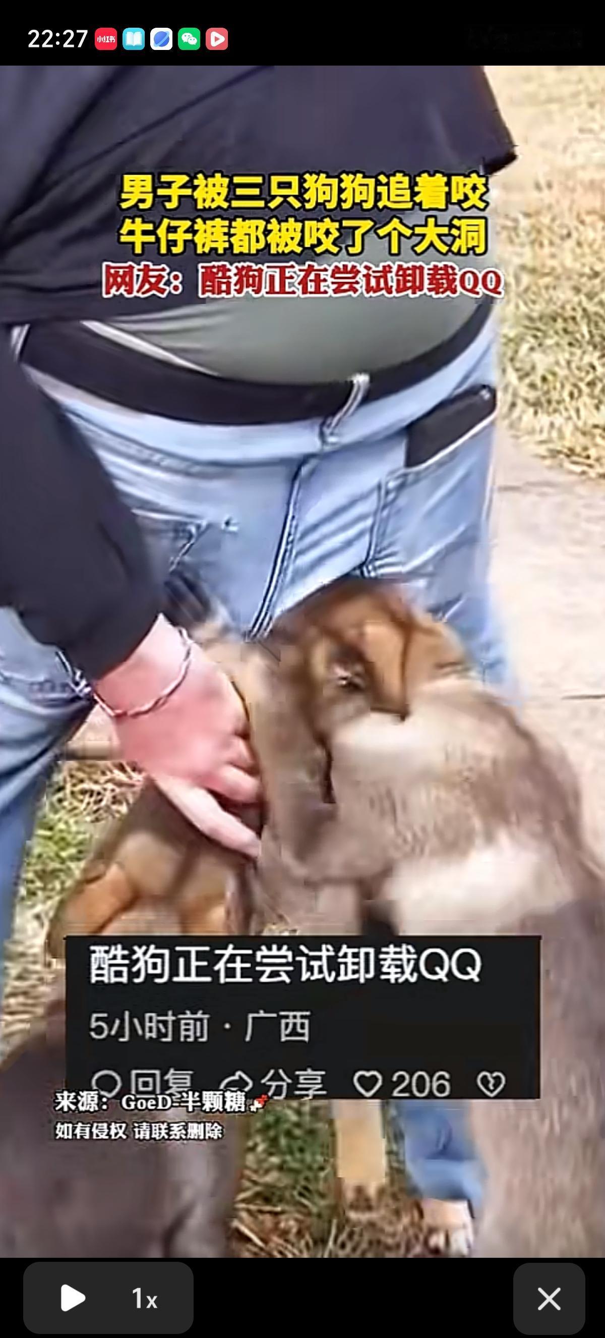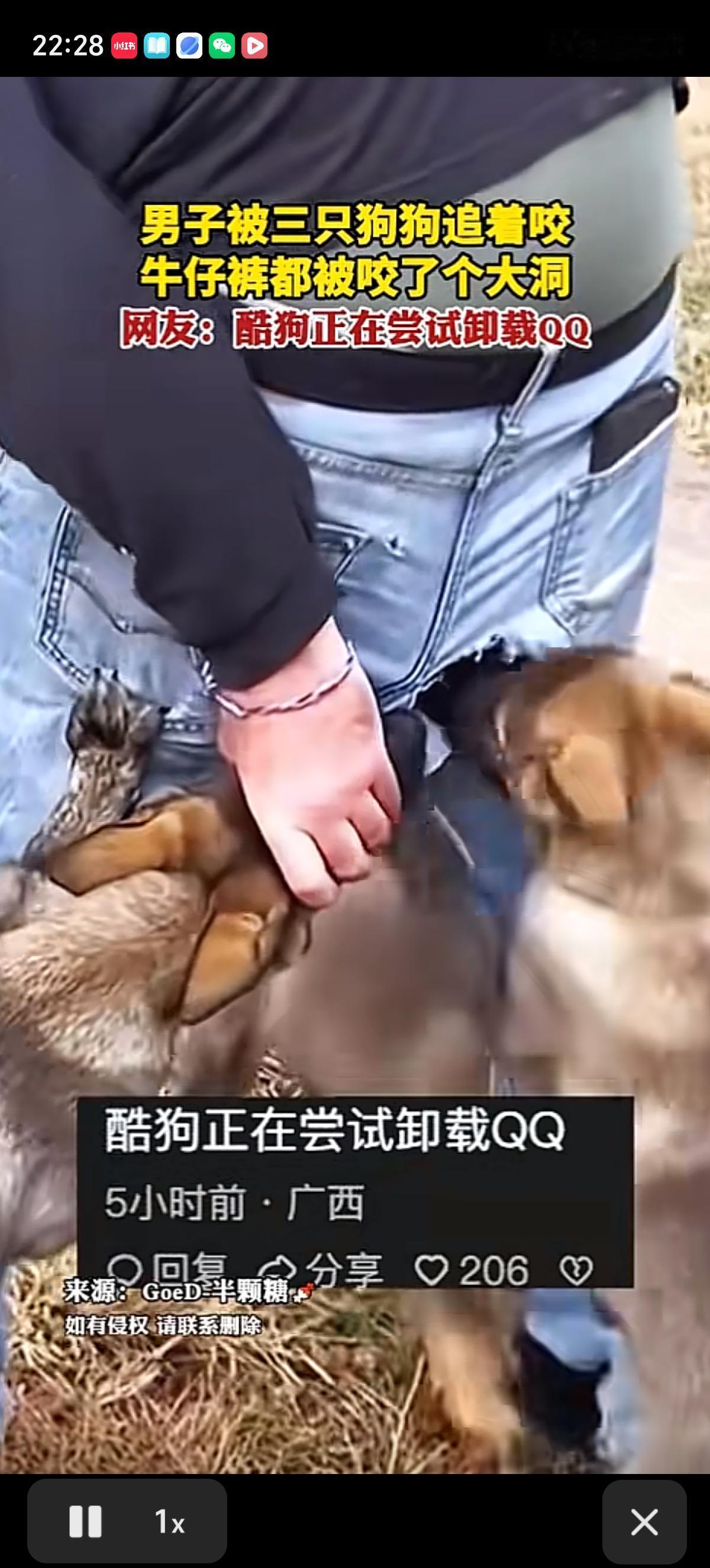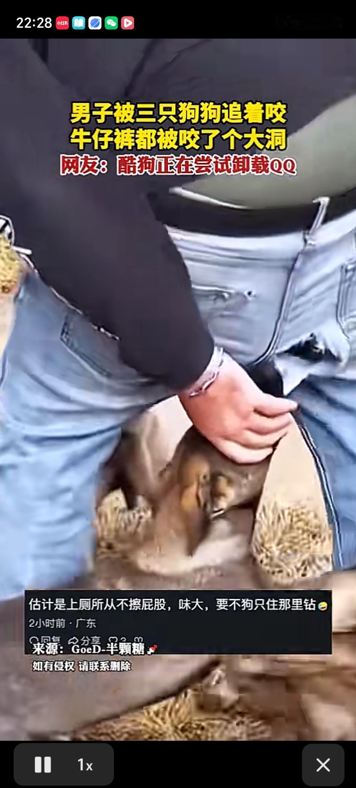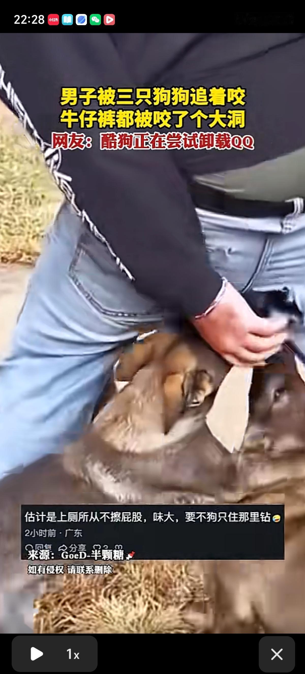 小伙子被三条黄狗追着咬,屁股上破了一个大洞,三条狗争先恐后的尝试把狗头顺着男子屁股破洞钻进去,有一条狗还成功了,可惜被这哥们把狗从破洞裤子里赶出去了。 小伙真是太不容易了,好半天搞不定三条大黄,努力捂着屁股预防狗头钻进去,牛仔裤是不能要了,都快被拔掉了。好消息是狗只对后边感兴趣,没动前边。 有网友问了,兄弟是不是上厕所没带纸,忘了擦屁股[捂脸]