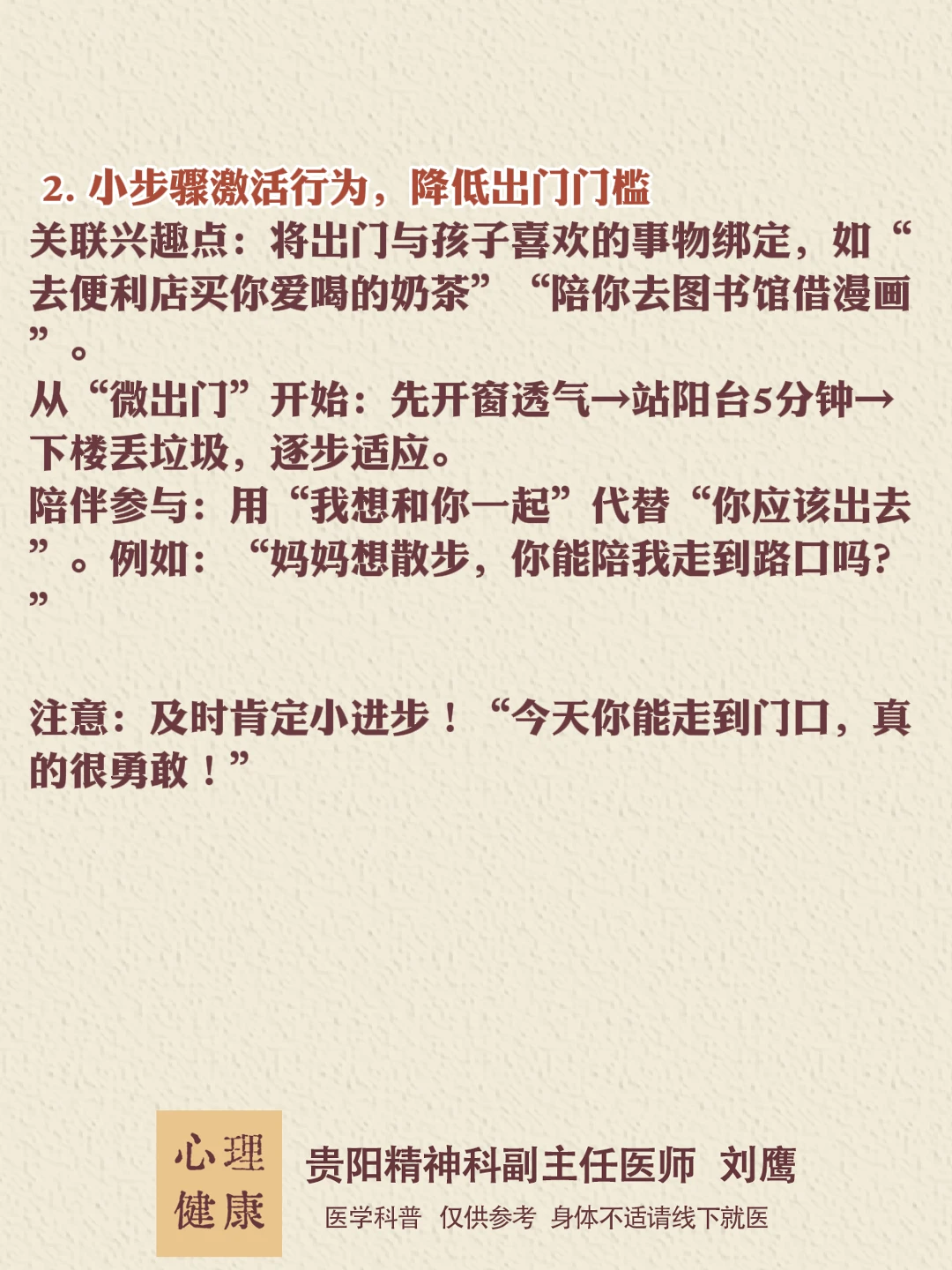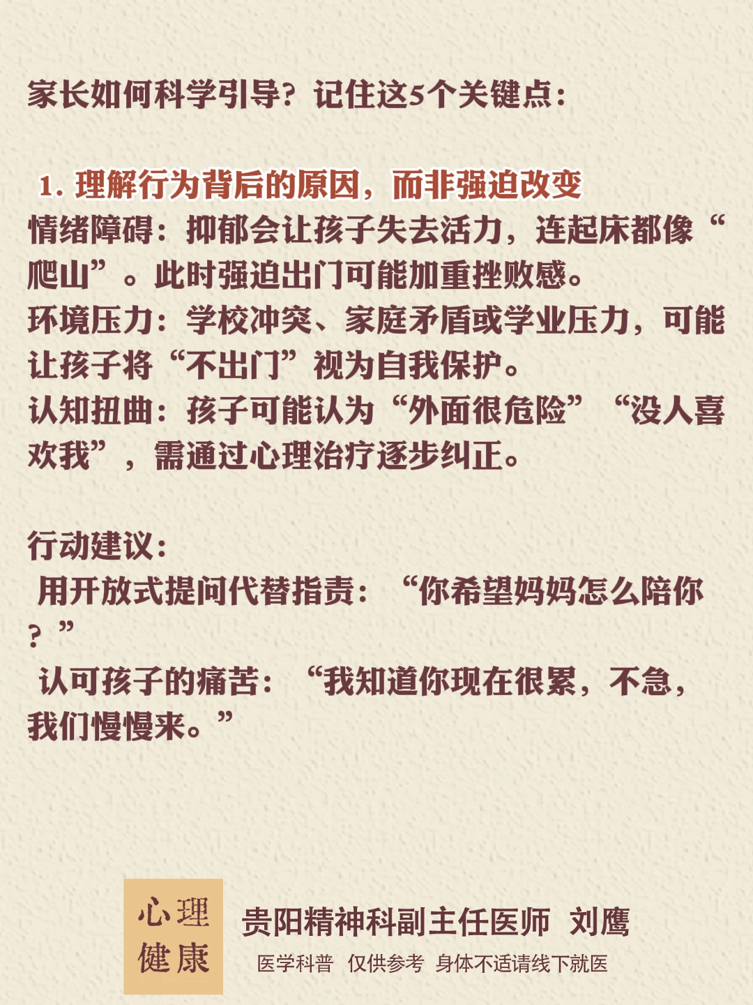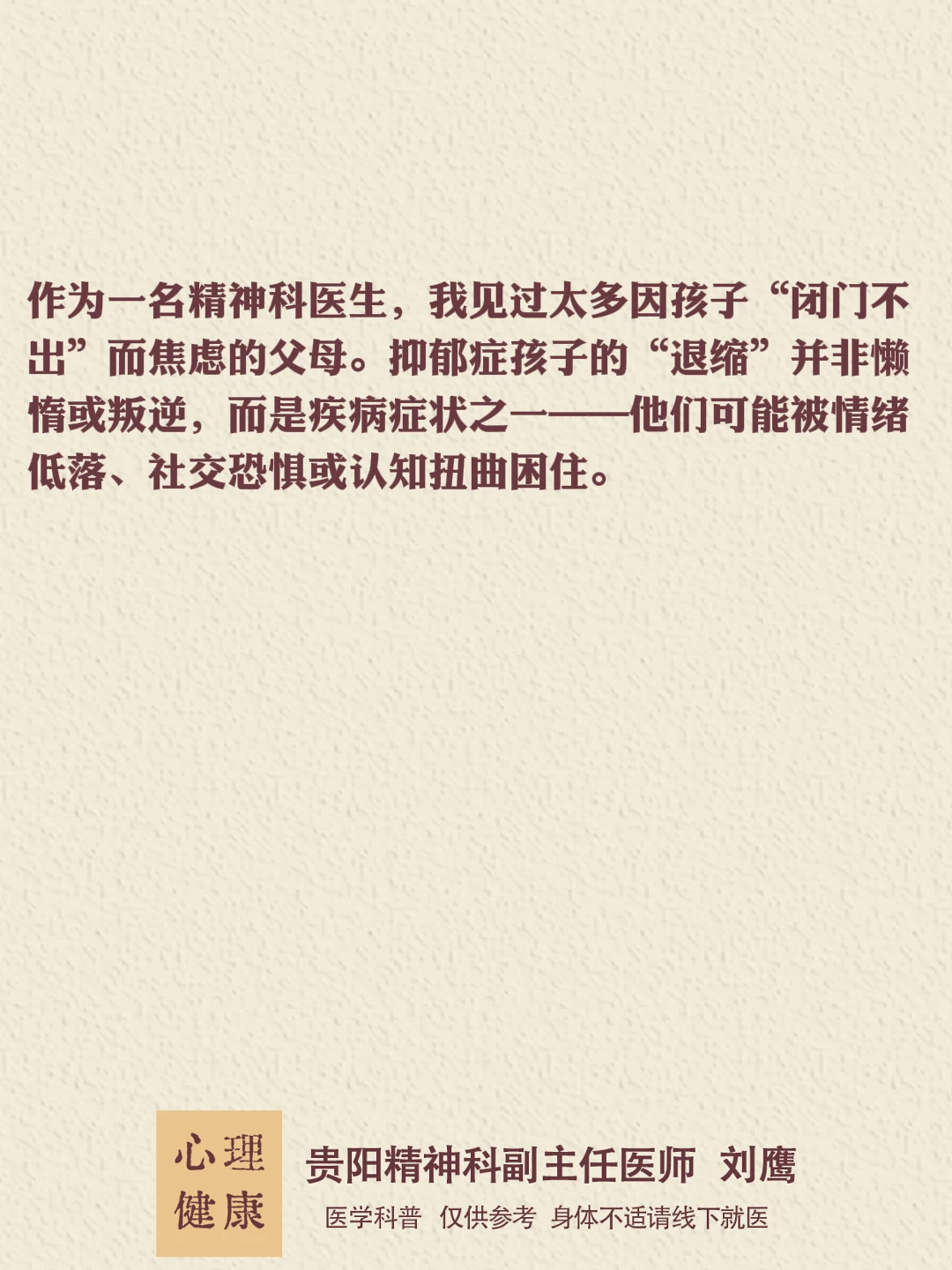 贵州的朋友们,大家好,我是贵阳精神心理科医生刘鹰。抑郁康复像解一团毛线,急不得。“当你不再用力拉拽,线头反而会自然浮现。” 用耐心和信任,陪孩子一点点找回出门的勇气。