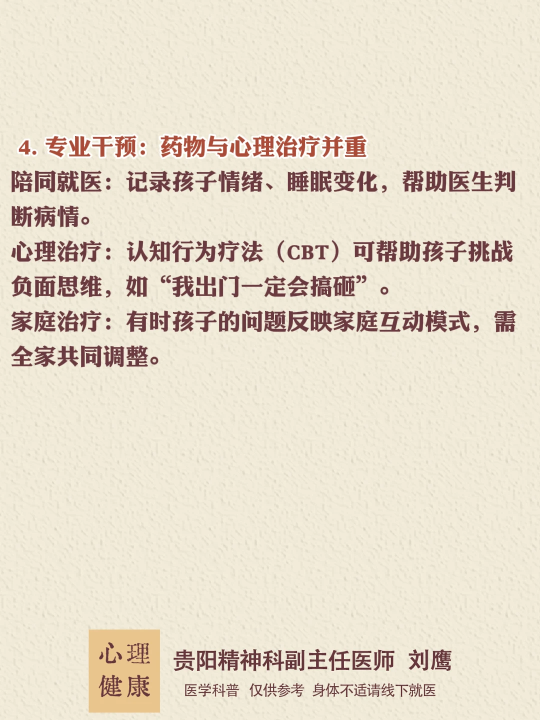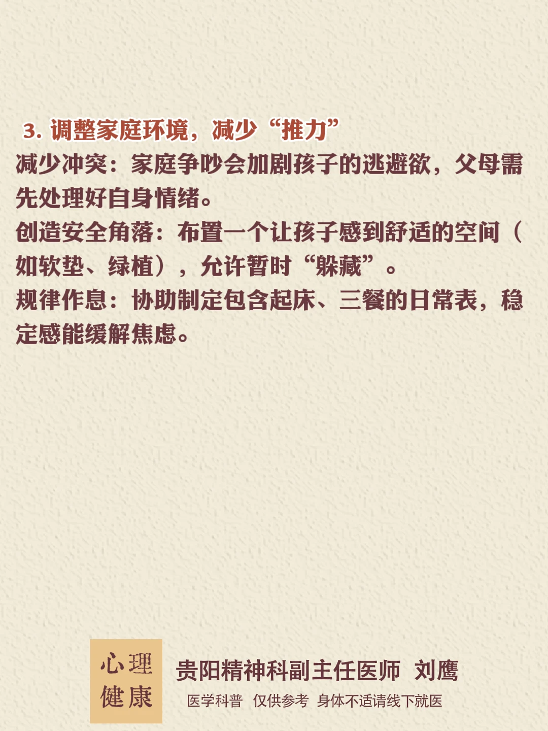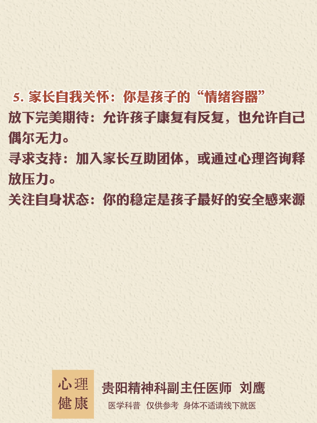 贵州的朋友们,大家好,我是贵阳精神心理科医生刘鹰。抑郁康复像解一团毛线,急不得。“当你不再用力拉拽,线头反而会自然浮现。” 用耐心和信任,陪孩子一点点找回出门的勇气。