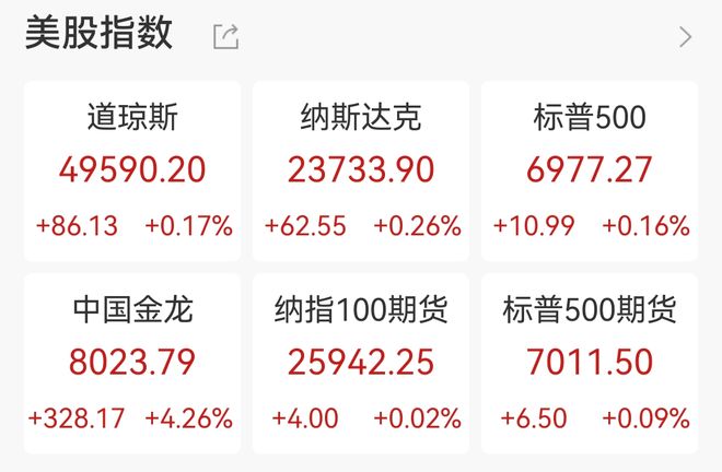 当地时间1月12日,美股三大指数集体收涨,道琼斯指数涨0.17%,标普500指数涨0.16%,双双创下历史新高。纳斯达克综合指数涨0.26%。
