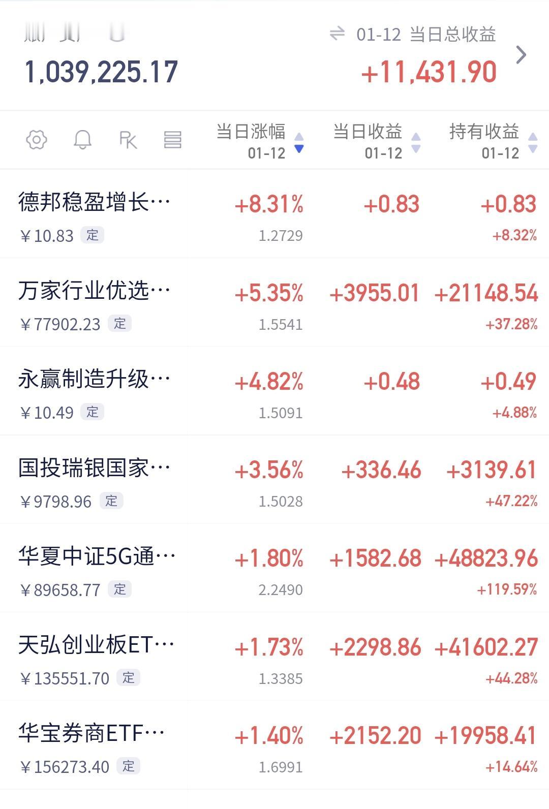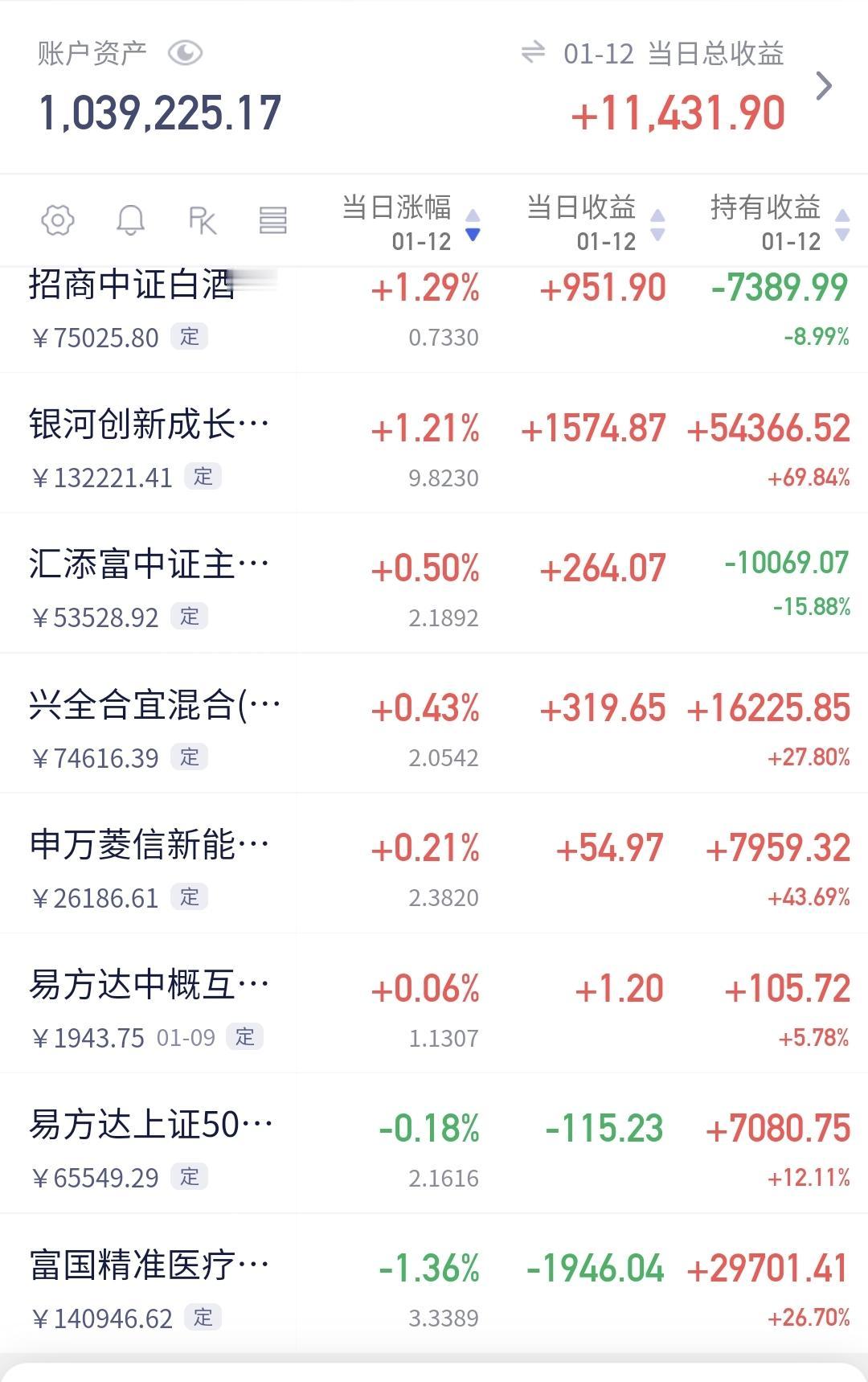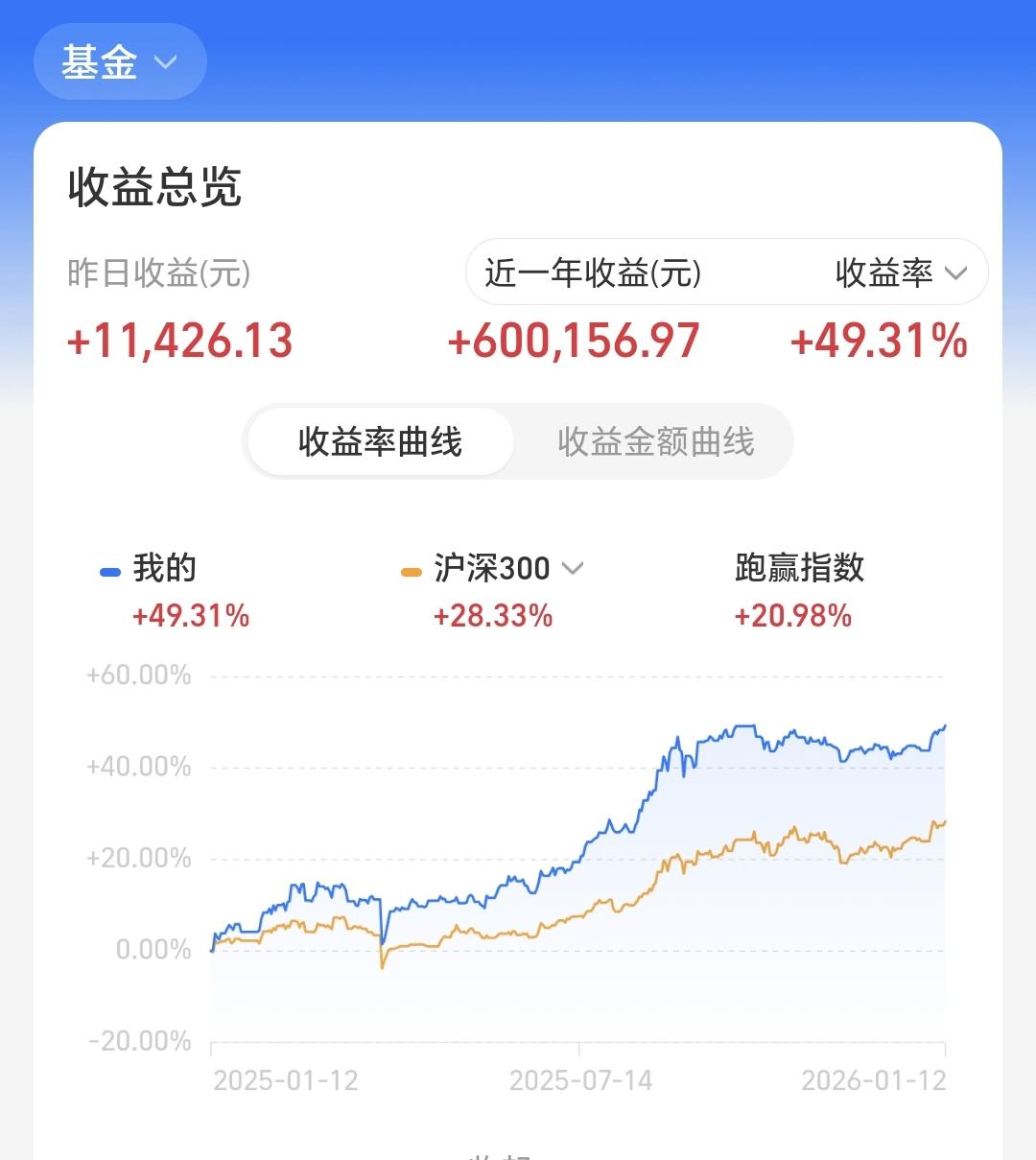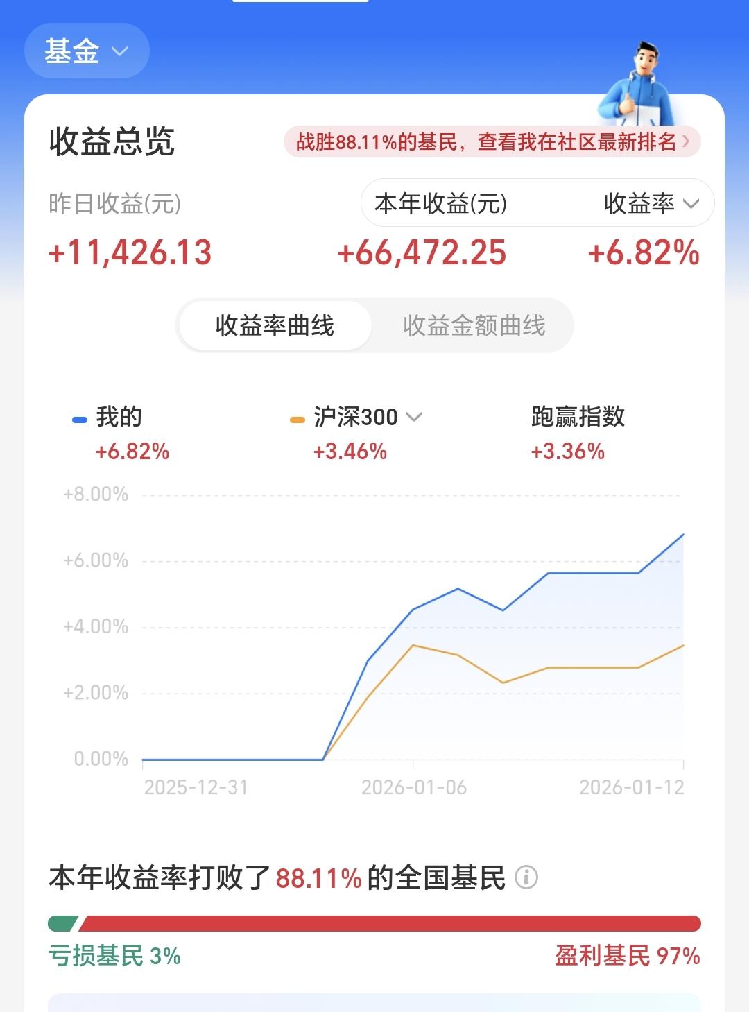 基金:今年有没有进场的机会 昨天基金收益11426元,基金持有1040718元,现金持有883116元,资产总额1923835元,超过了去年9月18号止盈时候的188万。 周有了一个交易日,昨天的收益就是本周的收益,本周的收益也是11426元。 本月有了6个交易日,1亏5赢,1个交易日亏损,5个交易日盈利,月收益66472元。 今年以来收益66472元,收益率6.82%,跑赢了全国88.11%的基民,也跑赢了沪深300指数3.46%的上涨幅度。 近一年以来收益600156元,收益率49.31%,跑赢了沪深300指数28.33%的上涨幅度。 持有的基金中,昨天晚上净值更新以后,上涨幅度最大的三个板块是:AI应用板块,先进制造板块,可控核聚变板块,下跌的只有医疗板块和上证50板块。 欧洲市场昨天晚上涨跌不一,德国上涨了0.57%,英国上涨了0.16%,法国下跌了0.04%,涨跌幅度都不大。 美股市场昨天晚上上涨,纳斯达克指数上涨了0.26%,道琼斯指数上涨了0.17%,标普指数上涨了0.16%,上涨的幅度也都不大。 昨天我有两只新基金,设置了每天10块钱的定投,这不是进场,这只是观察,AI应用板块的那只基金,昨天上涨幅度超过了8%,可控核聚变的那只基金上涨幅度也超过了3%,再强调一下,这不是进场,现在不是进场好的时间节点。 有朋友在上一篇文章的评论区问,今年还有没有进场的机会?我不知道他说的这个今年是春节之前还是2026年全年,春节之前能不能进场还不确定,2026年全年,肯定会有进场机会的,而且不是一个进场机会,因为,每年都会有人声鼎沸,每年都会有鬼哭狼嚎,人声鼎沸的时候,考虑的是要不要止盈出来观望,鬼哭狼嚎的时候,考虑的是要不要进场捞筹码,现在我们需要保持住定力,需要在市场鬼哭狼嚎的时候,手上还要有现金,否则的话,市场再怎么样的无人问津,你手上没有现金,对你来说一点用都没有。 我每天都会分享我的观点,我的观点只代表我个人的看法,不能作为你操作的依据,据此操作后果自负。
