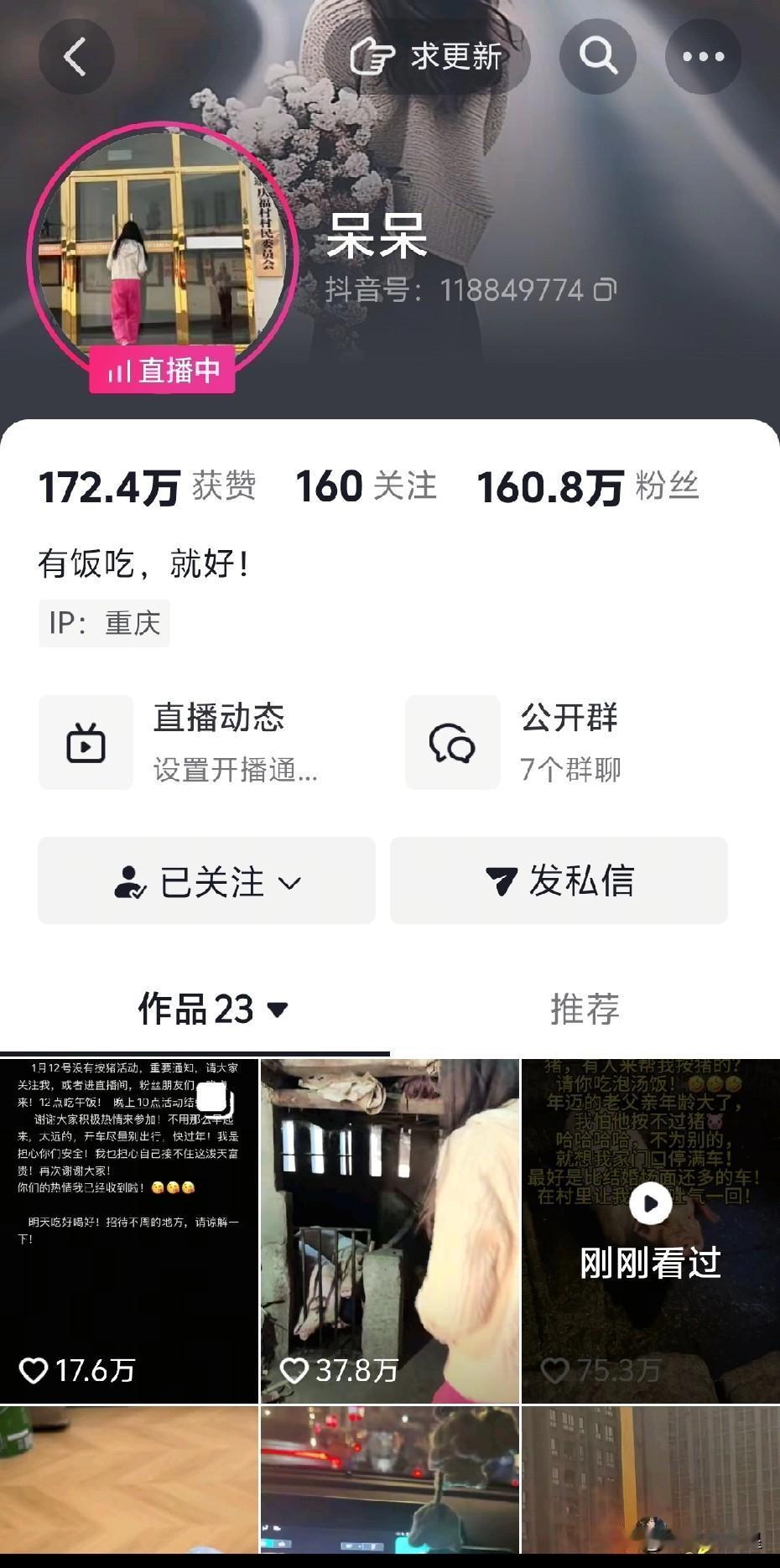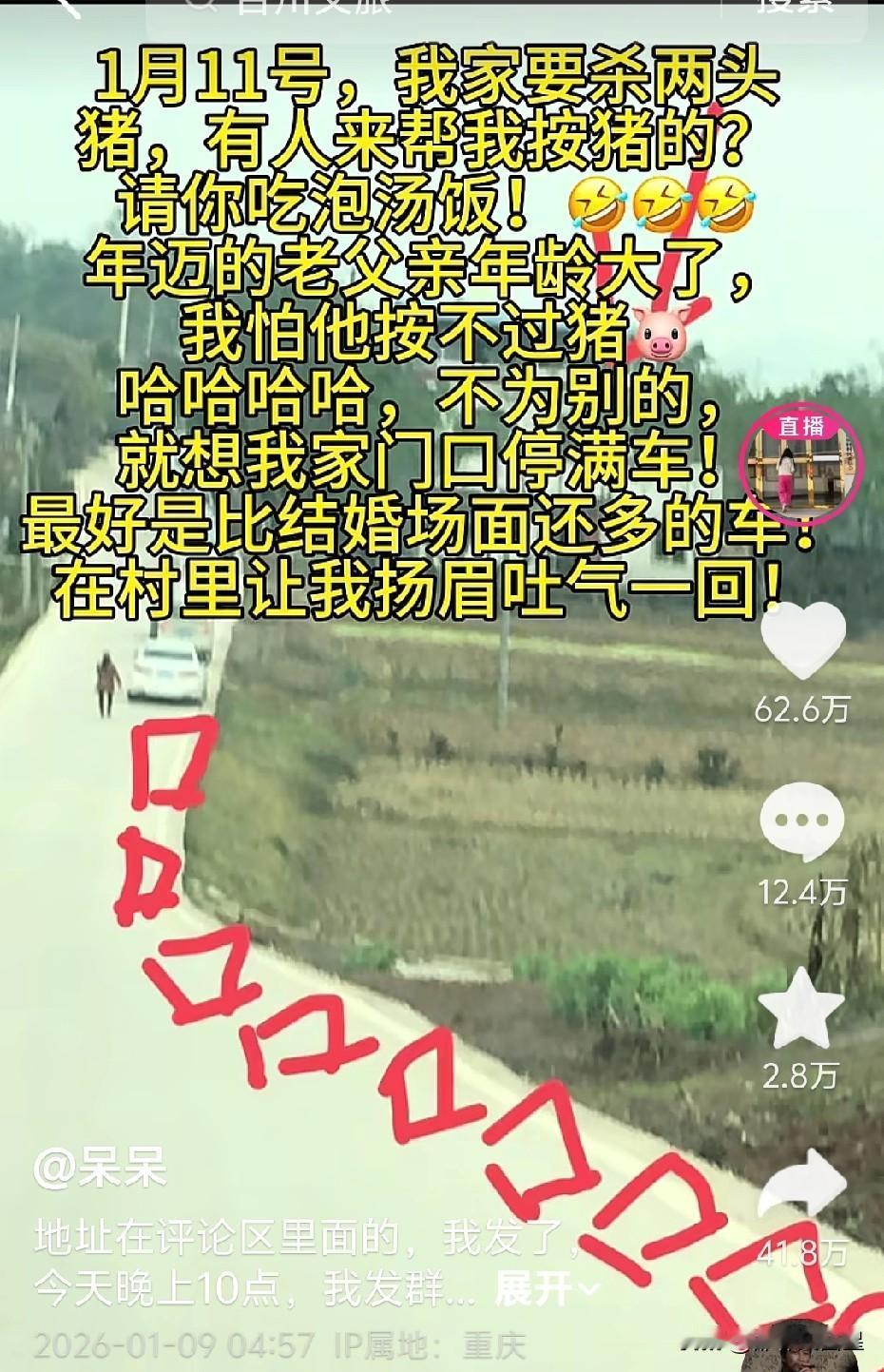 称重庆合川呆呆为2026年闯祸第一人,丝毫不为过。一个乡村女孩在网上的一句玩笑话,敌过合川文旅全年的努力。 1月9日,重庆合川女孩呆呆在网上求助,称家里打算1月11日杀年猪,因父母年迈,怕杀猪时按不住猪,希望有人能帮忙。 按理说,呆呆当时抖音粉丝不过几百,发这样的帖子也就是开个玩笑。可她万万没想到,11日那天,竟有上千名来自全国各地的网友赶来帮忙,当天最终杀了5头猪。 由于此事来得突然,当地文旅局连夜赶到呆呆家协调。当天,交警、安保迅速到场,电力、电信、各媒体等部门也齐聚呆呆家的刨猪汤现场。 据悉,11日到场网友达2000多人,12日更是多达万人。一个乡村女孩的一句玩笑,带火了一座城,让合川文旅全体工作人员全年的工作业绩相形见绌。 昨晚,这场活动已圆满结束,不知道明年呆呆还敢不敢再发帖让网友去帮忙按猪?重庆网红呆呆