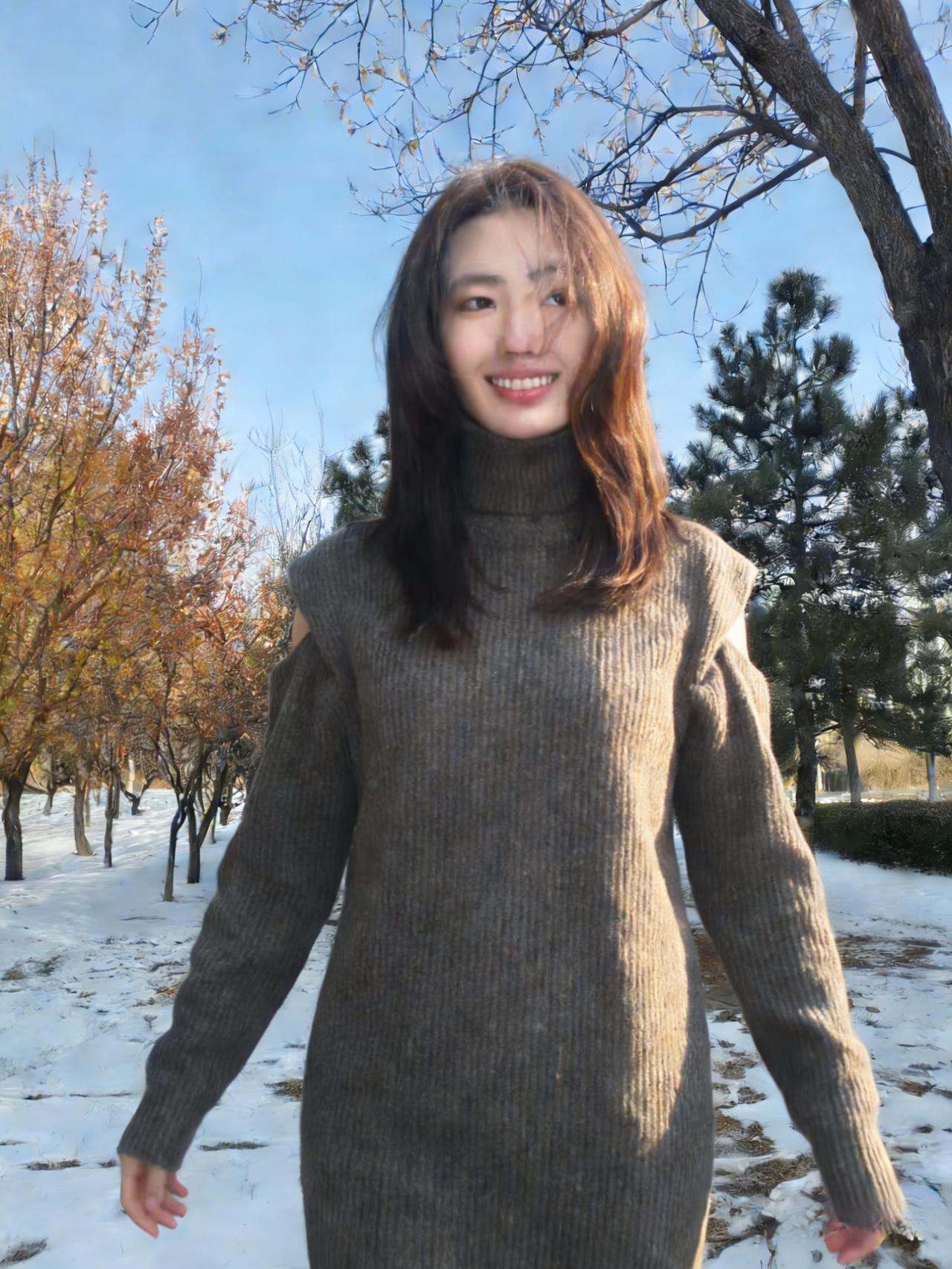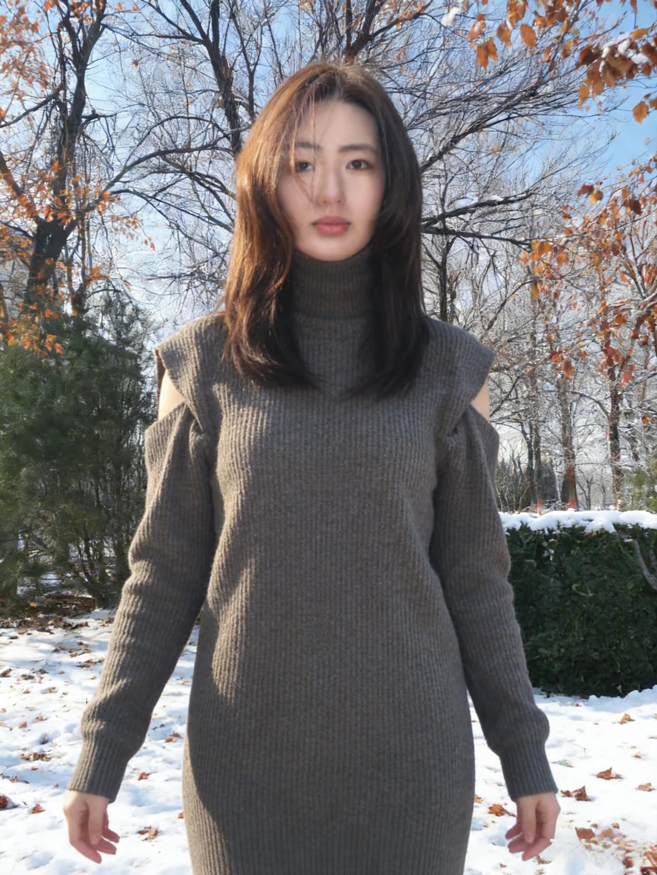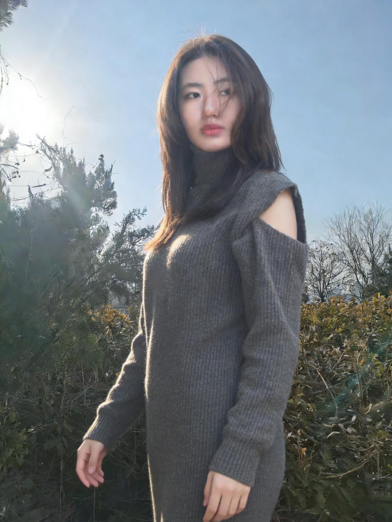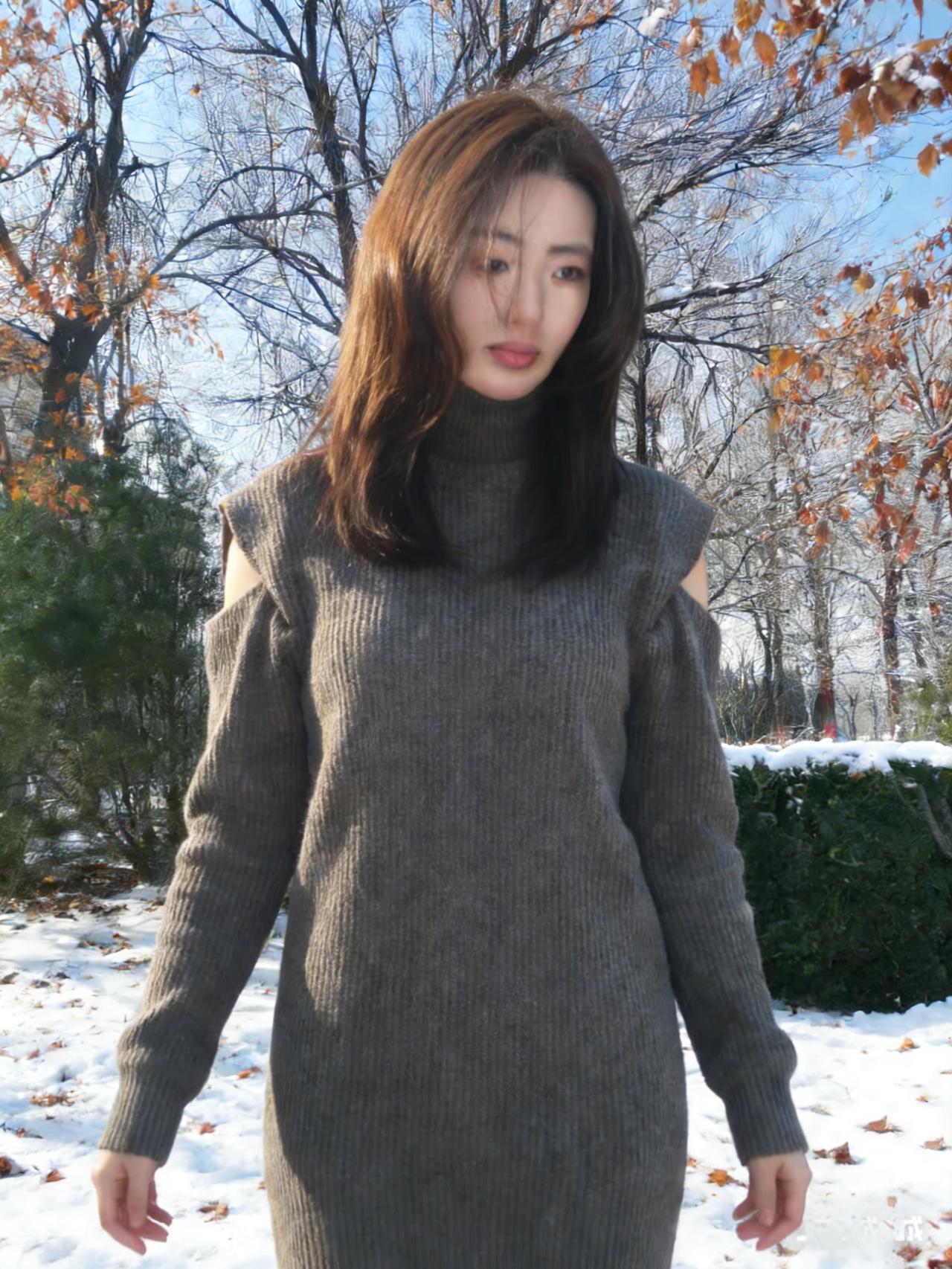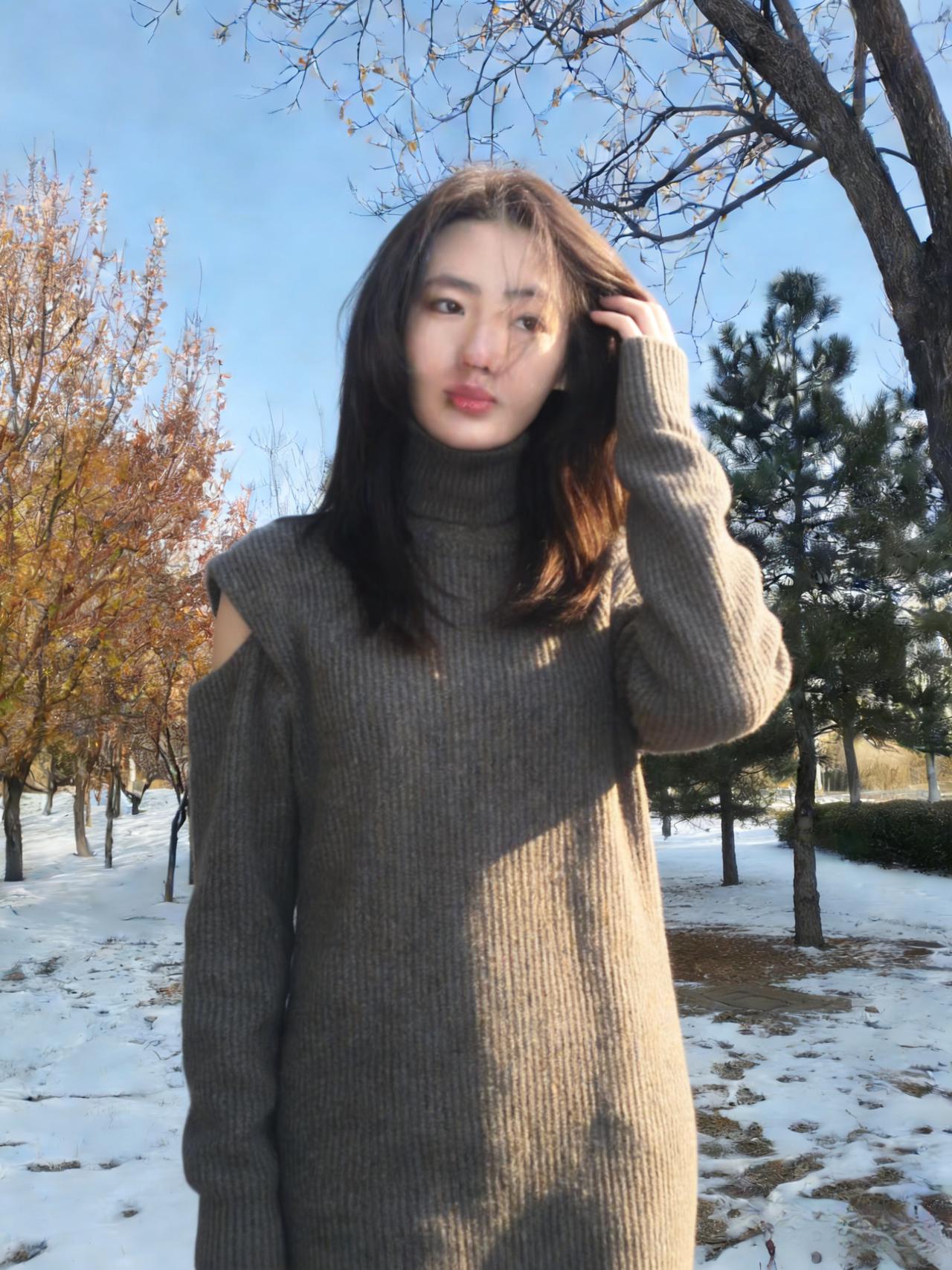 树影把她框进冷调的画框 高领遮住半分言语,露肩袒露三分坦荡 针织的纹路是皮肤之外的第二层肌理 裹着不被风雪撼动的模样 ~ 雪在脚下沉默,枝桠在头顶摇晃 她的目光越过枯枝,落向远处的蓝 没有裙摆的飘摇,只有针织的厚重 却把自由,缝进露肩的缝隙里 ~ 每一次抬手,每一次垂眸 都是与冬日的私语 在荒芜的风景里,她不是过客 是把自己活成风景的,独行者
