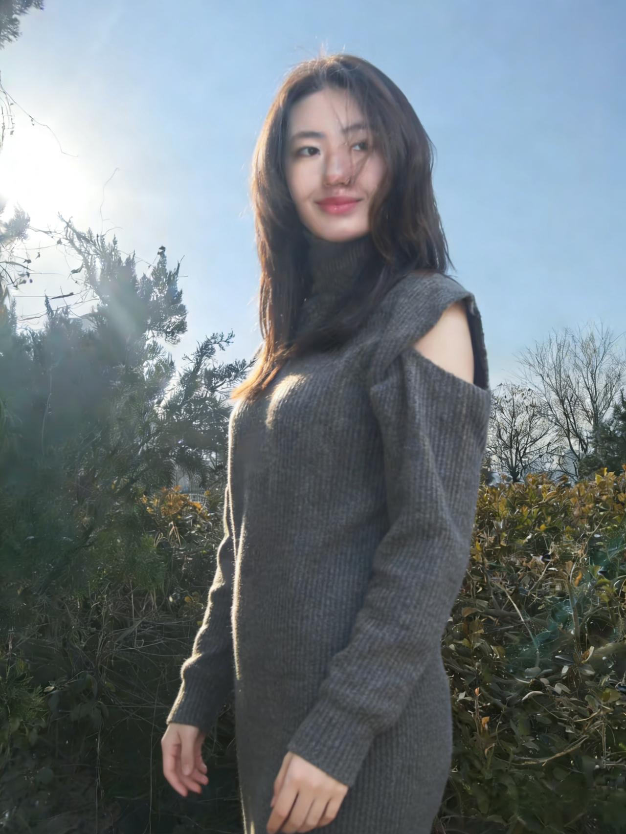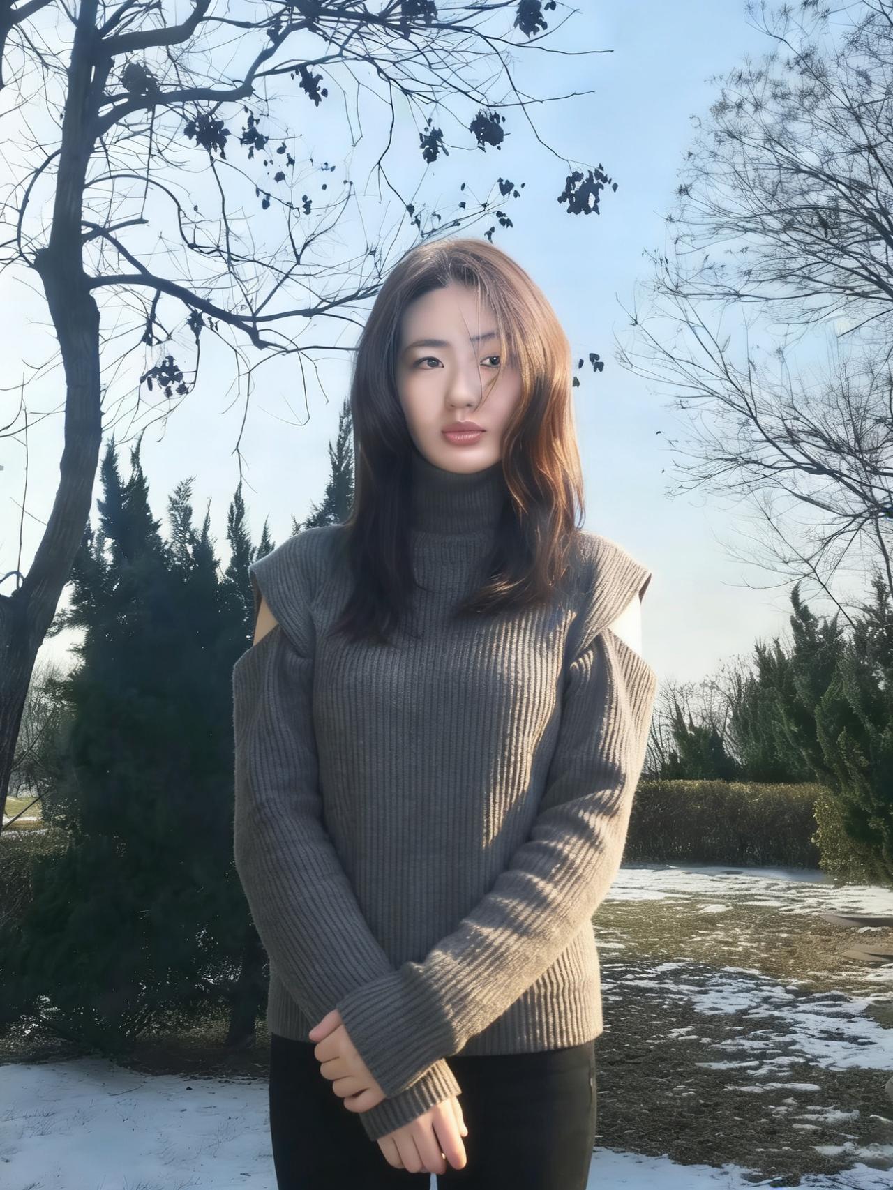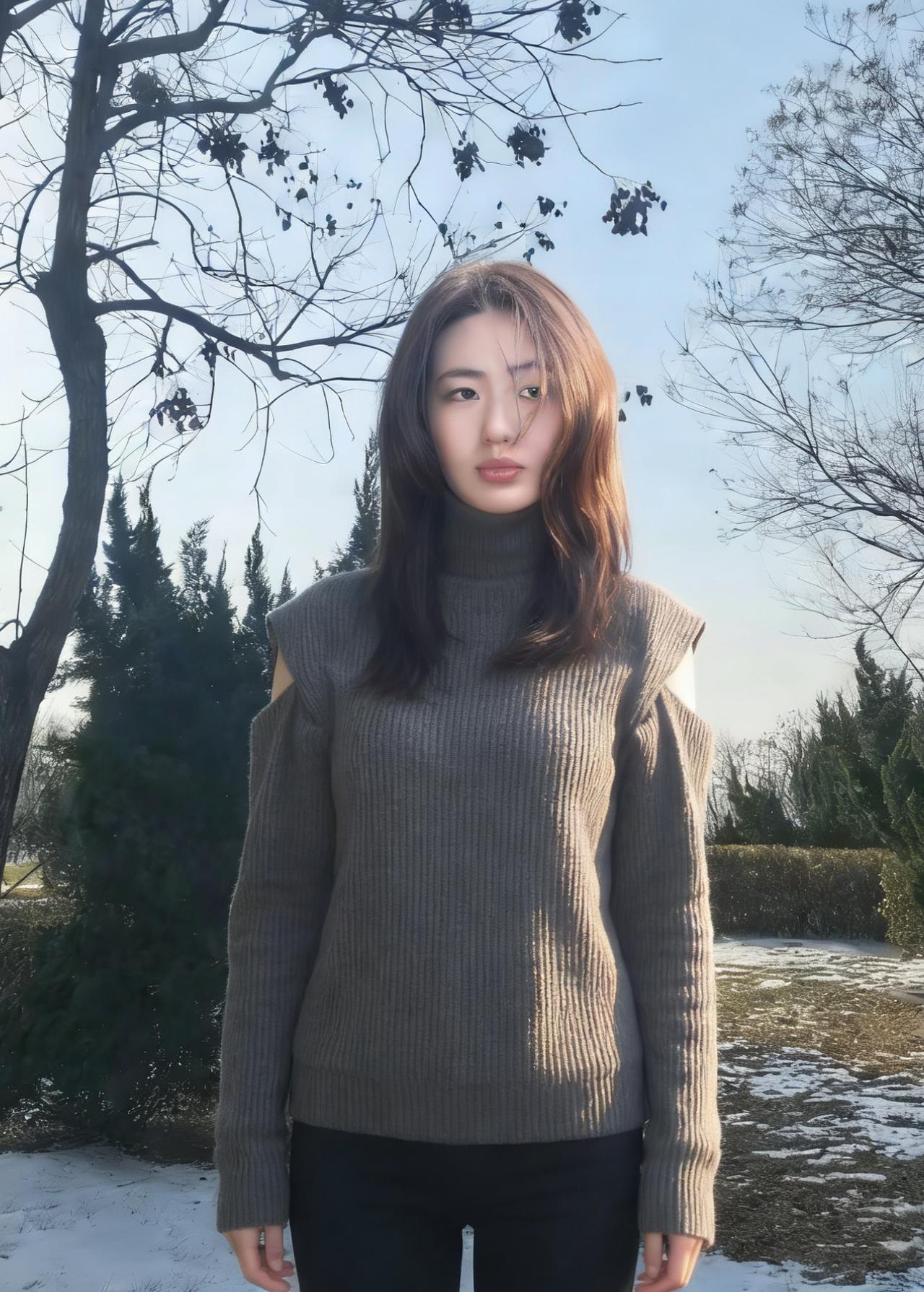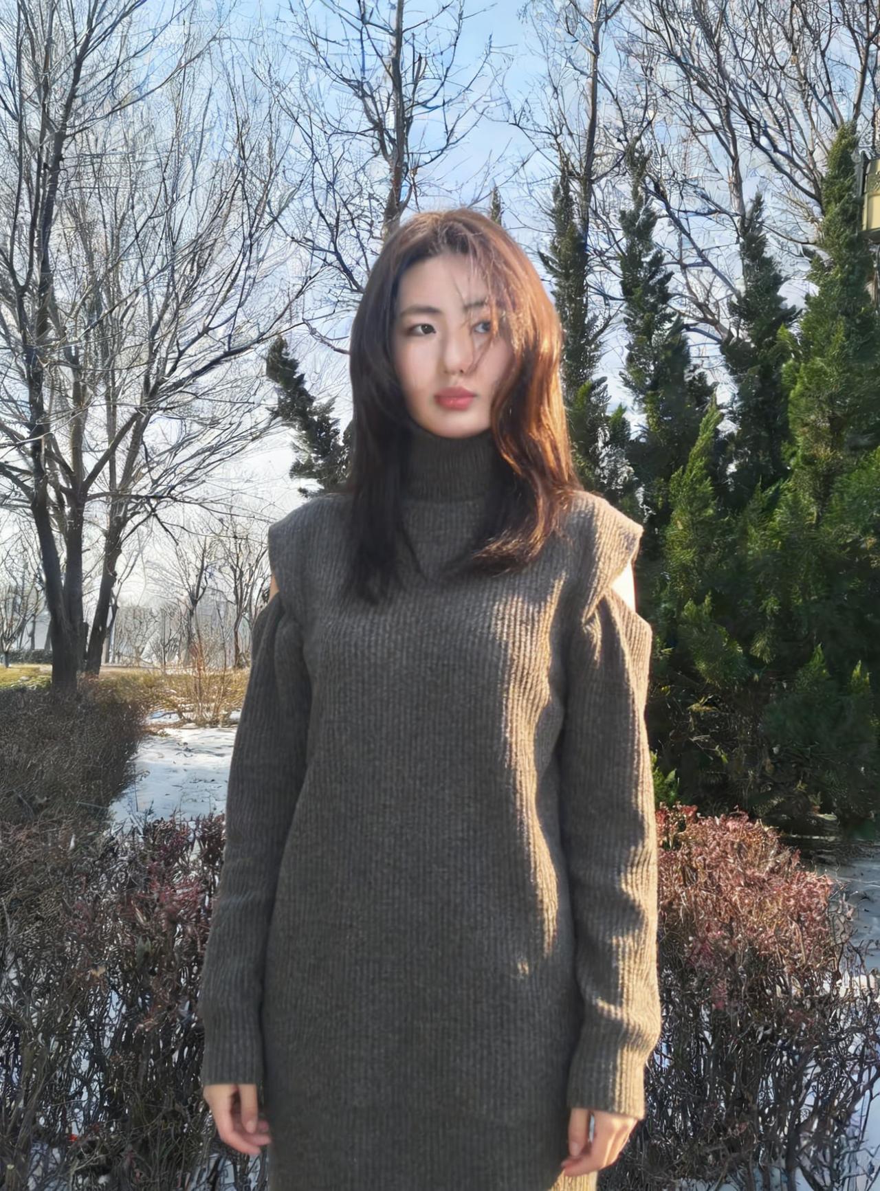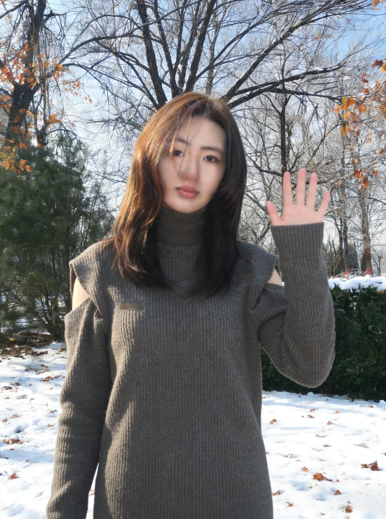 树影把她框进冷调的画框 高领遮住半分言语,露肩袒露三分坦荡 针织的纹路是皮肤之外的第二层肌理 裹着不被风雪撼动的模样 ~ 雪在脚下沉默,枝桠在头顶摇晃 她的目光越过枯枝,落向远处的蓝 没有裙摆的飘摇,只有针织的厚重 却把自由,缝进露肩的缝隙里 ~ 每一次抬手,每一次垂眸 都是与冬日的私语 在荒芜的风景里,她不是过客 是把自己活成风景的,独行者