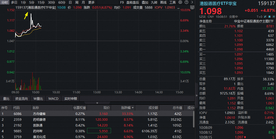 1月13日早盘,港股通医药全线上攻!医疗主题板块连续第8日上涨,AI医疗相关个股方舟健客狂飙33%,医脉通一度涨超10%。港股通医疗T+0“利器”——港股通医疗ETF华宝(159137)盘中一度触及涨停,现涨4.87%!