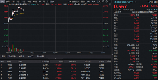 港股通创新药板块同步上行,荣昌生物领涨逾9%,三生制药涨超7%,创新药纯度100%的港股通创新药ETF(520880)盘初摸高3%,实时成交超2.7亿元。