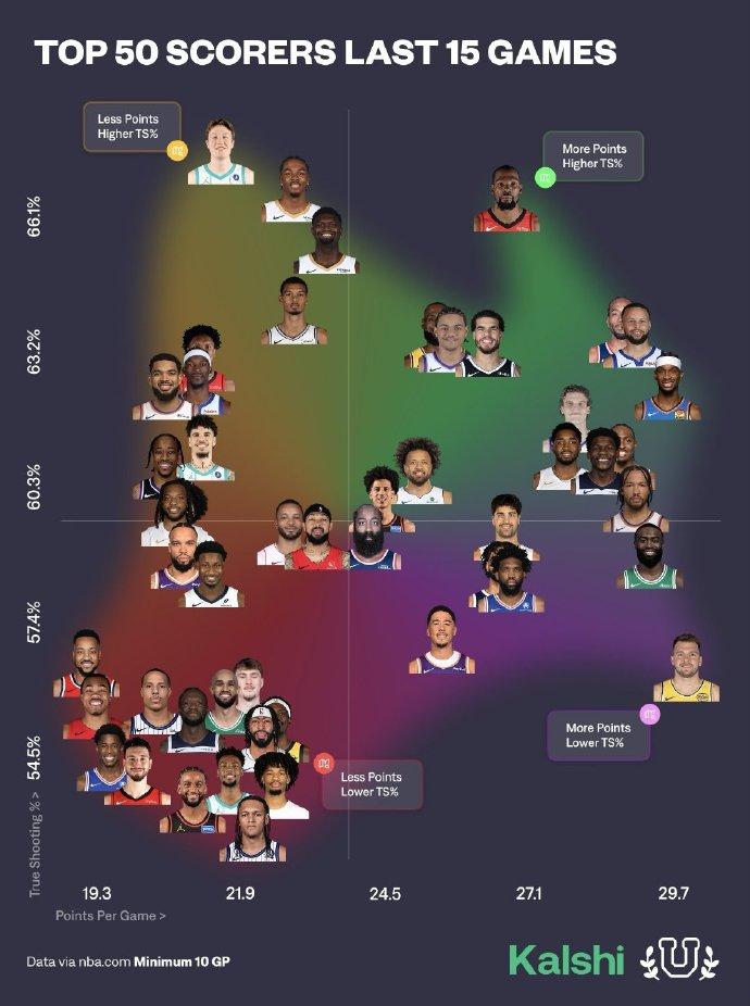 过去15场比赛得分榜前50球员: 纵轴:效率更高 横轴:场均得分更高 出现在第一象限的球员,得分高、效率高的人只有11人,包括:杜兰特、库里、小卡、詹姆斯、华子、坎宁安、马克西、米切尔、马尔卡宁、乔治、小波特。 而比较搞笑的是火箭队。 右上角的杜兰特,得分、效率双高,左下角的申京,得分、效率双低! 而过去一段时间,火箭队关键时刻的处理球,不是杜兰特来,就是申京来,乌度卡觉得这俩一个水平,但数据上,似乎不支持这种说法。