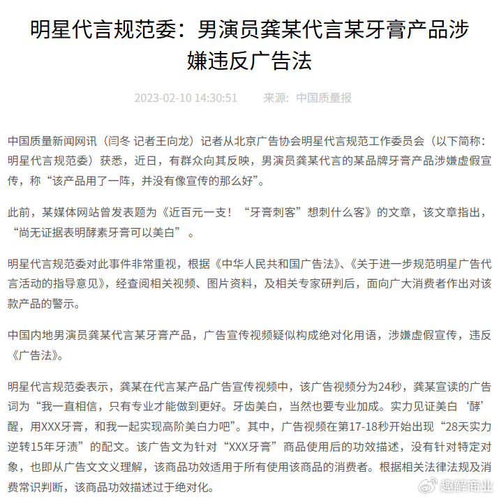 2023年2月,明星代言规范委公开发文表示,“中国内地男演员龚某代言某牙膏产品,广告宣传视频疑似构成绝对化用语,涉嫌虚假宣传,违反《中华人民共和国广告法》(下称《广告法》)。”