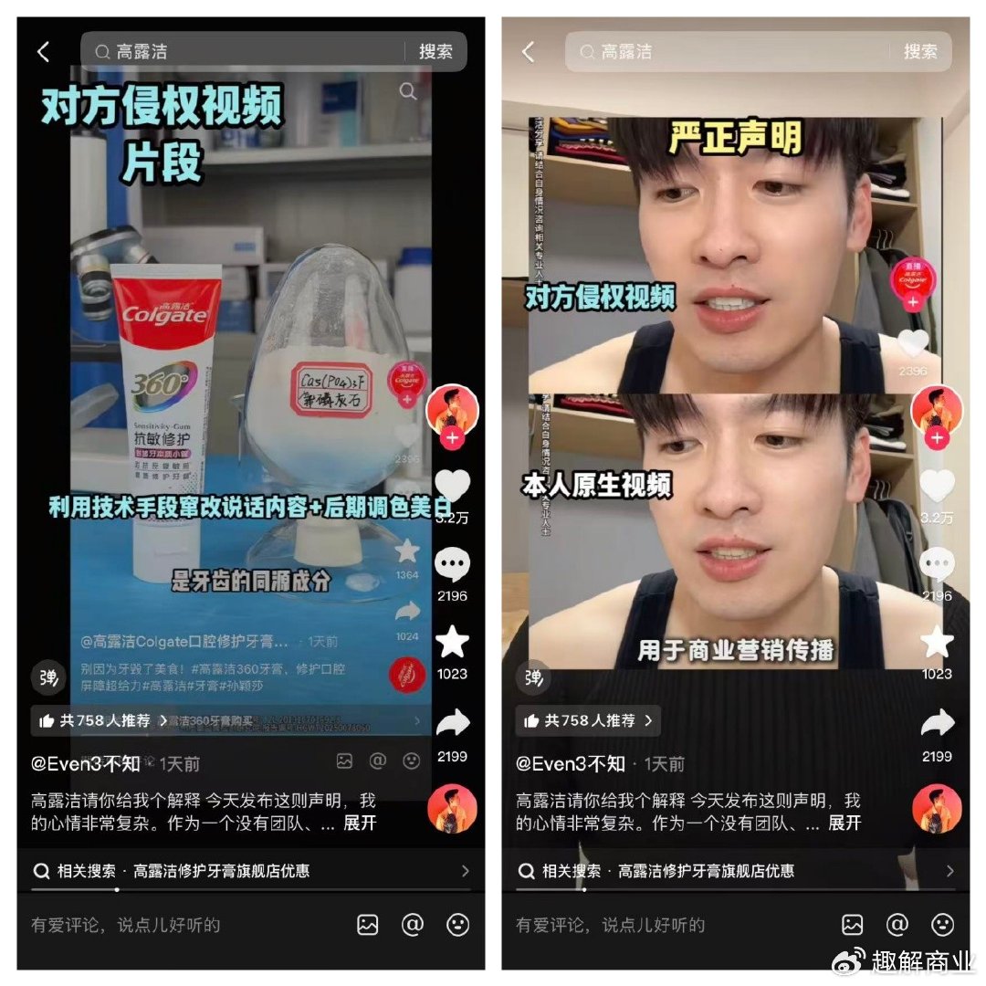 该博主在视频中表示,自己于2025年2月28日发布的关于牙贴片关闭牙缝的原创视频,部分内容被“高露洁colgate口腔修护牙膏直播间”篡改,并在未获授权的情况下用于商业推广。