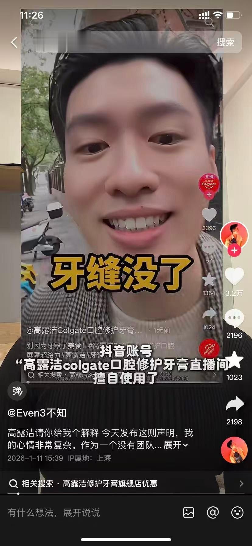 1月11日,视频博主“Even3不知”在社交媒体平台发帖称,其原创视频被高露洁抖音旗舰店授权账号“高露洁colgate口腔修护牙膏直播间”擅自用于商业营销,并利用AI技术手段对其视频语音部分及牙齿颜色进行修改。
