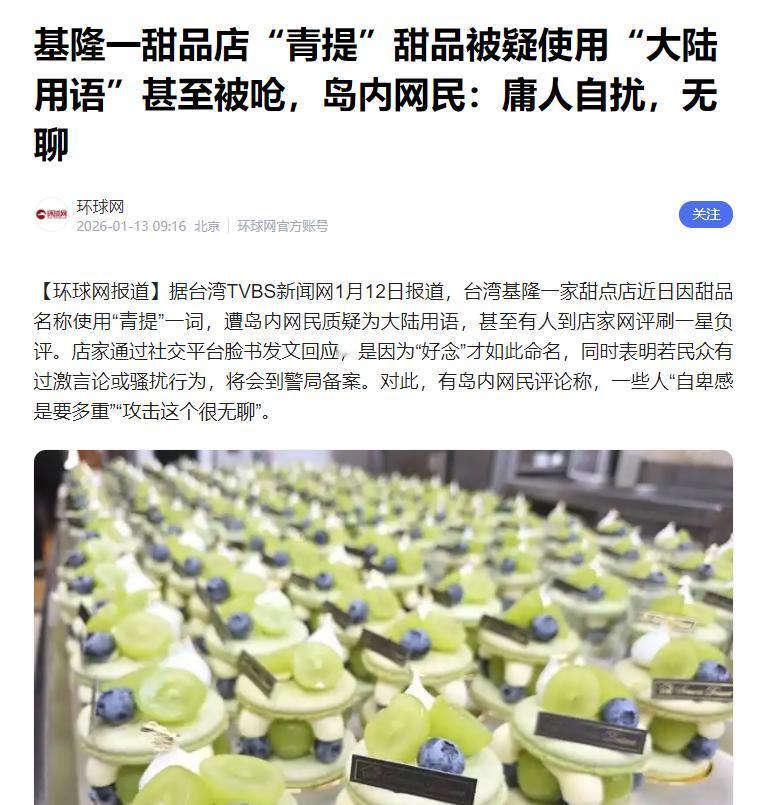 台湾基隆的一家甜点店被“网暴”了!原因竟与大陆有关! 根据台湾TVBS新闻网1月12日的报道,这家店在基隆,店里卖的都是草莓、蓝莓这些常见的甜点,就一道“青提乳酪塔”惹了麻烦。 有群人不知道是闲的还是被人撺掇,发私信骂店家,逼着把“青提”改成“绿葡萄”,还说不改就抵制,放狠话“绿葡萄就绿葡萄,为啥叫青提”,更过分的是喊着让店家“滚出台湾”“开不下去”。 好好的生意被搅得不得安宁,店家没办法,只能在脸书发文解释,说用“青提”就是因为好念,还说要是再有人敢过激骚扰,就报警备案。 这事儿出来后,不少台湾网友都看不下去,留言说“攻击这个太无聊了”“得有多自卑才会干这种事”,公道自在人心,谁都能看出来这是没事找事。 可能有人会说,不就是个名字吗?至于这么折腾?但我要跟大家说,这真不是个案,是岛内长期有人故意搞“去中国化”,煽动排陆情绪闹出来的。 还有更离谱的,有民进党民代发现台湾初中课本里把马铃薯叫土豆,居然跳出来大闹,说“土豆是大陆用语”,还炒作什么“文化统战”,连教育部门的人都跟着附和,说课本不能用大陆用语,这简直是滑天下之大稽。 最让人受不了的是,这些搞网暴的人,根本不是为了台湾老百姓好,就是拿民众当棋子捞政治好处。 大家想想,台湾这些年食品安全问题那么多,2011年塑化剂危机,好多知名厂商都涉案,有毒的东西流进千家万户,危害老人孩子健康。 2014年地沟油案,全台20个县市都受影响,食品产业损失上百亿新台币,这些真正关乎老百姓性命的大事,他们从来不管。 反而盯着一个甜点名字上纲上线,说白了就是想靠制造两岸对立,转移大家对民生问题的不满。 这种排陆情绪已经害了不少人,台湾有名的面包师傅吴宝春,拿过世界冠军,就因为说过“身为中国人很骄傲”,支持两岸一家亲,就被民进党支持者疯狂诋毁抵制,生意都受了影响。 还有之前的“淘宝台湾”,本来运营得好好的,帮不少台湾商家赚了钱,却被民进党当局扣上“陆资”的帽子逼得下架,好多人因此丢了工作。这些人打着“爱台湾”的幌子,干的全是伤害台湾民众的事。 甚至为了让这种排陆情绪有市场,民进党还总故意编造谎言抹黑大陆,说大陆多贫困,甚至荒谬地宣传“大陆人吃不起茶叶蛋”“吃不起榨菜”。 前段时间还有亲绿人士在节目里胡扯“大陆高铁没有靠背”,把无知当噱头,就是想误导台湾民众,营造大陆不如台湾的假象。 说到底,两岸同胞本来就是一家人,说话用词有差异很正常,相互交流是好事,怎么就成了“罪过”?基隆这家甜点店的遭遇,就是这种病态情绪的集中爆发。 好在还有不少台湾网友明辨是非,支持店家,这说明公道自在人心。真心希望岛内能少点这种荒唐的对立,多些务实交流,毕竟只有两岸好好相处,台湾老百姓才能真正过上好日子。