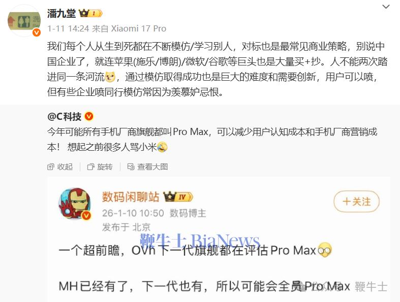 1月13日消息,近日,小米产业投资部合伙人潘九堂对手机厂商旗舰机型对标ProMax做出评价。潘九堂认为,对标很常见的商业策略,就连苹果、谷歌等巨头也都是大量买+抄。