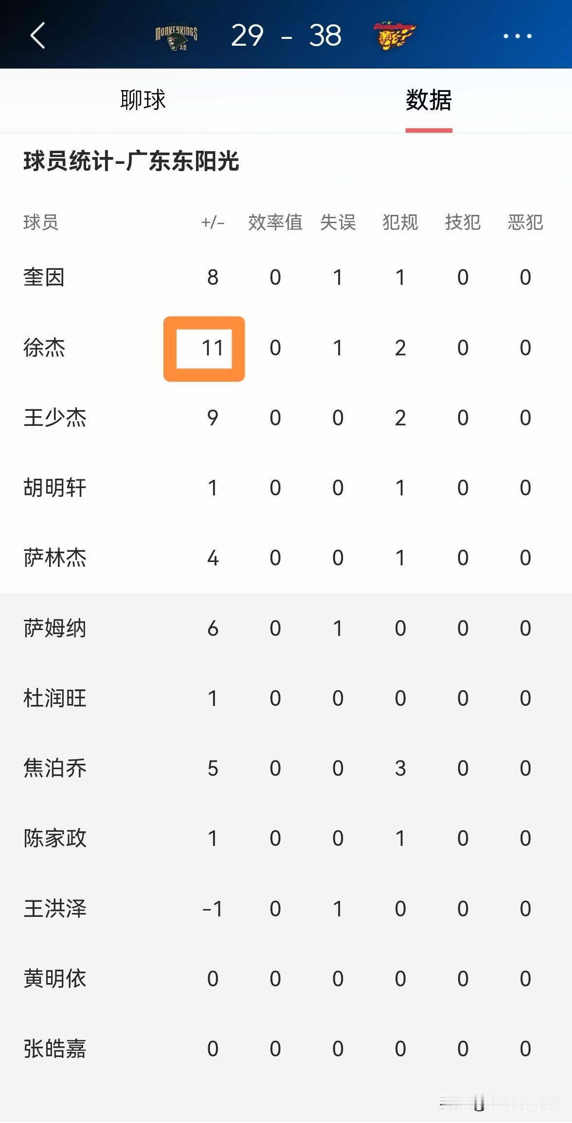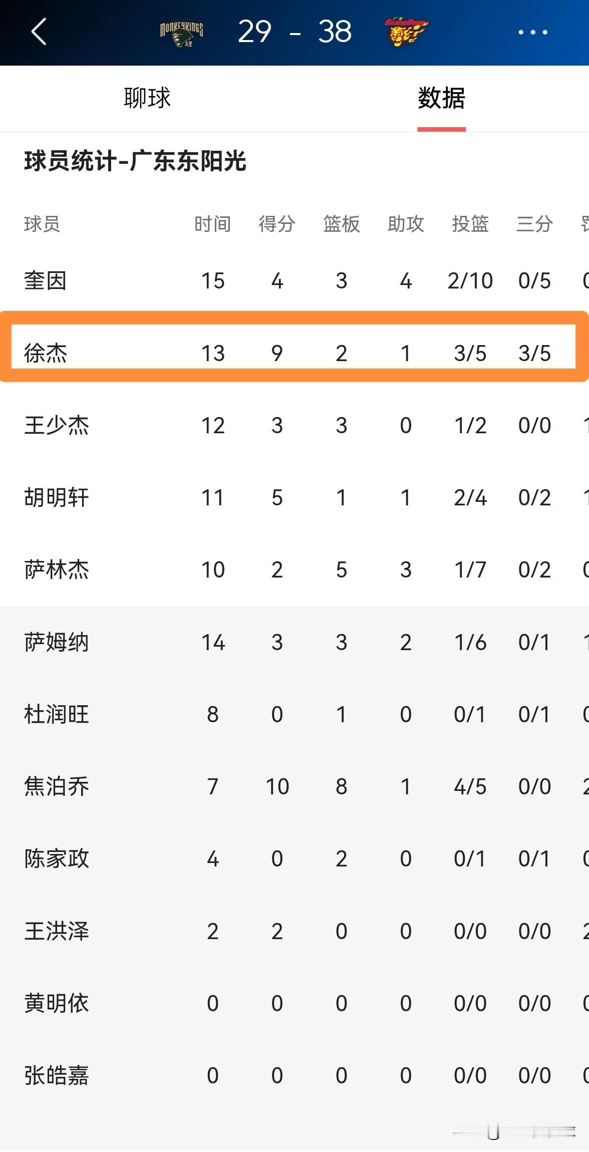 我对广东东阳光当家控卫徐杰真是赞不绝口!在今天广东东阳光客场挑战南京天之蓝的比赛中,目前双方的上半场比赛已经结束,广东东阳光以38:29领先对手9分。在前两节比赛中,徐杰首发出战13分钟,三分球5中3非常高效的砍下9分,还有2篮板1助攻,他的场上正负值为全队最高的+11。 实事求是的说,在前两节比赛中,广东东阳光两大外援奎因和萨姆纳双双发挥失常,但是广东东阳光依然能够取得领先优势,关键的原因就是徐杰,事实再次证明徐杰才是广东东阳光的定海神针。