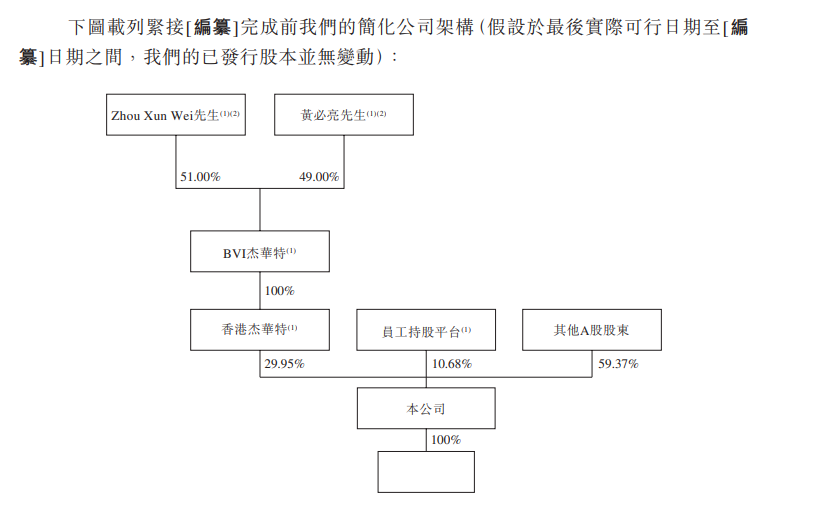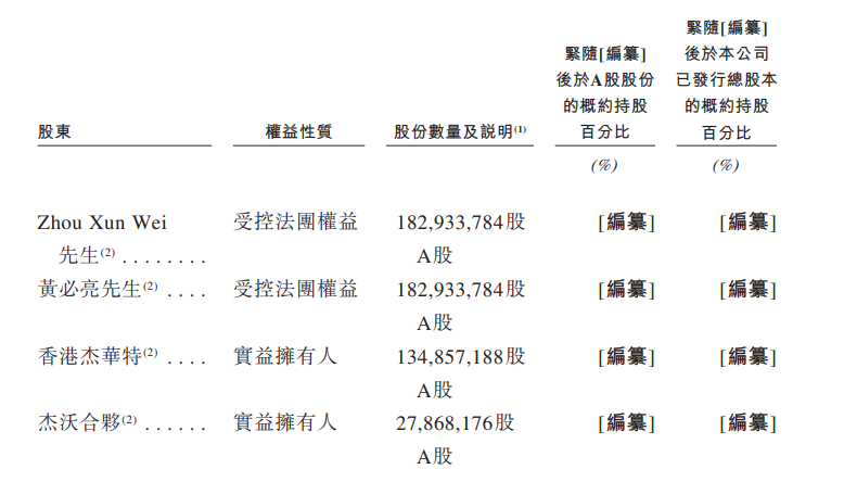 Zhou先生(ZhouXunWei先生)、黄先生(黄必亮先生)、BVI杰华特、香港杰华特、海口芯创、杰沃合伙、杰特合伙、杰微合伙、杰瓦合伙、杰程合伙及杰湾合伙将共同拥有并控制182,933,784股A股股份,占截至最后实际可行日期公司已发行股份总数约40.62%,并将于[编纂]时构成控股股东集团。