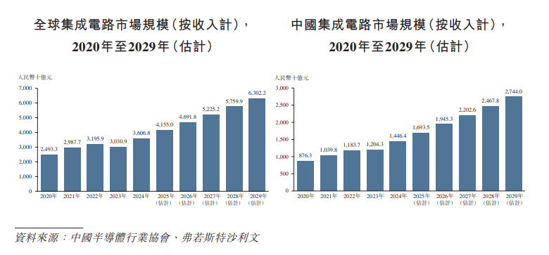 在人工智能、汽车电子和通讯技术等关键领域快速发展的推动下,全球集成电路市场在2020年至2024年期间实现了显著增长。市场总规模从2020年的人民币2.49万亿元飙升至2024年的人民币3.61万亿元,复合年增长率达到9.7%。展望未来,市场规模将持续扩大,2025年至2029年,复合年增长率将达到11.0%,2029年市场规模将达到人民币6.3万亿元。
