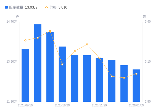 日期A股户数(户)流通A股户均持股数(股)户均持股市值(万元)2026-01-0913030025062.197.542025-12-3113180024776.967.382025-12-1913370024424.857.302025-11-2013430024315.737.612025-11-1013530024136.027.802025-10-3113540024114.357.672025-10-2013830023450.137.222025-10-1014330022631.917.542025-09-3014611922195.297.282025-09-1913740023603.737.69