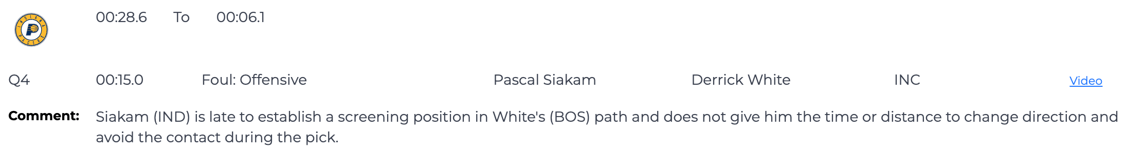 其中只有一次错误吹罚,发生在比赛还剩15秒时,裁判漏吹了帕斯卡尔-西亚卡姆的进攻犯规,报告中写道:“西亚卡姆(步行者)在德里克-怀特(凯尔特人)的移动路线上设立掩护位置时动作稍慢,未能给他足够的时间和空间改变方向,导致在掩护过程中无法避免身体接触。”
