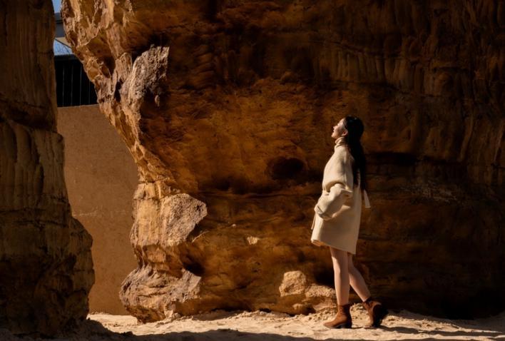 这里不仅是女装店,更是生活美学的容器——简约而富有设计感的服饰挂于原木架上,面料的温润触感与沙漠艺术装置相映成趣,每一处针脚都藏着对日常美学的考究,让穿搭成为艺术与生活的桥梁。女孩们或侧身坐于沙砾之上,或回眸望向光影深处,镜头定格的瞬间,便将这份荒漠美学的浪漫永久留存,让消费场景成为沉浸式的艺术体验。