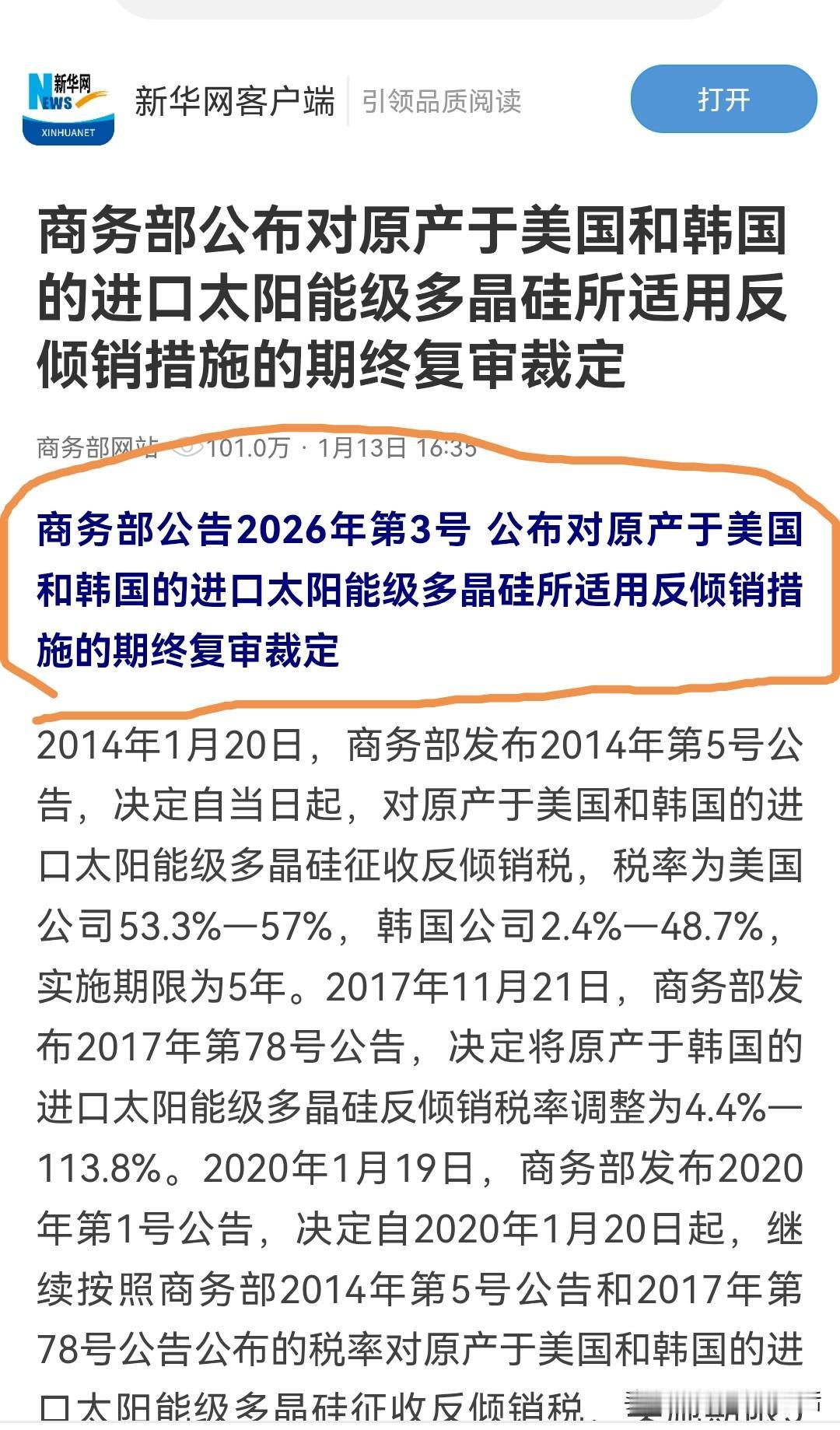中国的反霸权,从来不留隔夜的遗憾! 美国要征收和伊朗做生意的所有人关税! 我们立即对美韩征收反倾销税! 特朗普难道也就这点本事吗?本来想靠“星链”拿下伊朗,复制委内瑞拉的成功案例,没想到伊朗一个反制,让剧情反转,他们竟然利用“星链”的漏洞,抓获了大量的反对分子,把自己苦心经营多年的谍报系统,几乎给干趴下了。 眼看武力解决是行不通了,最又想到经济制裁,谁和他们做生意,美国都要多加25%的关税,让那些小国家因为害怕惹火上身,而放弃和伊朗做生意,最终让伊朗的经济先崩溃,达到最后的征服。 如今的社会,早已不是霸权说的算了,靠增加关税来威慑别人,已经行不通了,在全球经济的大环境下,只有平等互利才能达到共赢。 显然美国不想知道这个道理,也不愿意知道。 我们也早就看出来他们的真面目,也不再奢望他们能够回心转意,唯有亮出王牌才能让他们知道谁才有话语权。 就在他们损害我们正常贸易的利益的时候,我们商务部在不到24小时就发布了2026年3号文,对美国和韩国生产的太阳能级多晶硅进行反倾销,也就是提高关税比例,并且还是为期五年,五年以后,他们的这类产品还有现在的优势吗。 有人觉得韩国这次是误伤,是收到美国的牵连。但是李在明访问中国以后,又去日本都干了些什么? 他难道不是既要又要吗?要想让周边国家老实,只有拿出王牌,让他们害怕才行。 你们觉得韩国真的有意亲中吗?