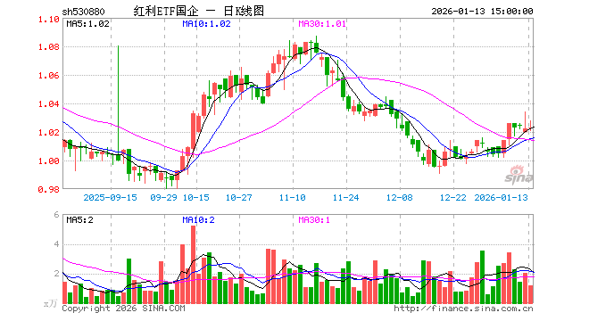 1月13日,红利ETF国企(530880)涨0.10%,成交额122.93万元。当日份额减少50.00万份,最新份额为5283.60万份,近20个交易日份额增加100.00万份。最新资产净值计算值为5399.31万元。