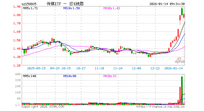 1月14日,传媒ETF(159805)开盘跌1.67%,报1.763元。传媒ETF(159805)重仓股方面,分众传媒开盘跌1.50%,巨人网络跌0.47%,恺英网络跌1.25%,岩山科技跌1.75%,昆仑万维跌0.33%,利欧股份涨5.20%,三七互娱跌2.10%,光线传媒跌0.61%,神州泰岳跌0.15%,芒果超媒跌1.03%。