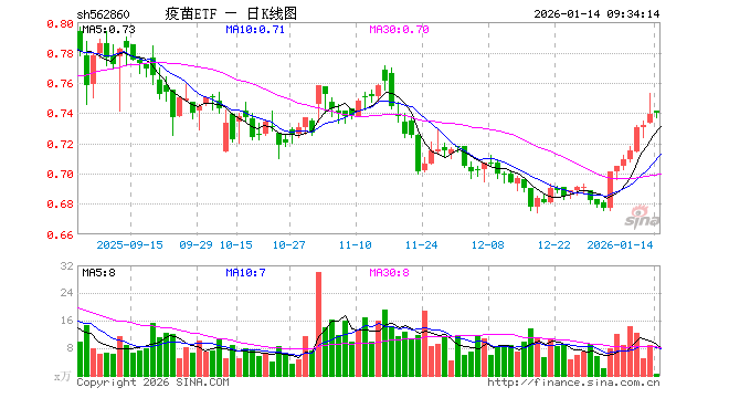 1月14日,疫苗ETF(562860)开盘涨0.27%,报0.741元。疫苗ETF(562860)重仓股方面,智飞生物开盘跌1.14%,万泰生物跌0.28%,沃森生物跌0.08%,荣昌生物跌1.28%,辽宁成大涨0.16%,康泰生物跌0.25%,长春高新跌0.77%,甘李药业跌0.13%,山东药玻涨1.36%,华兰生物跌0.25%。