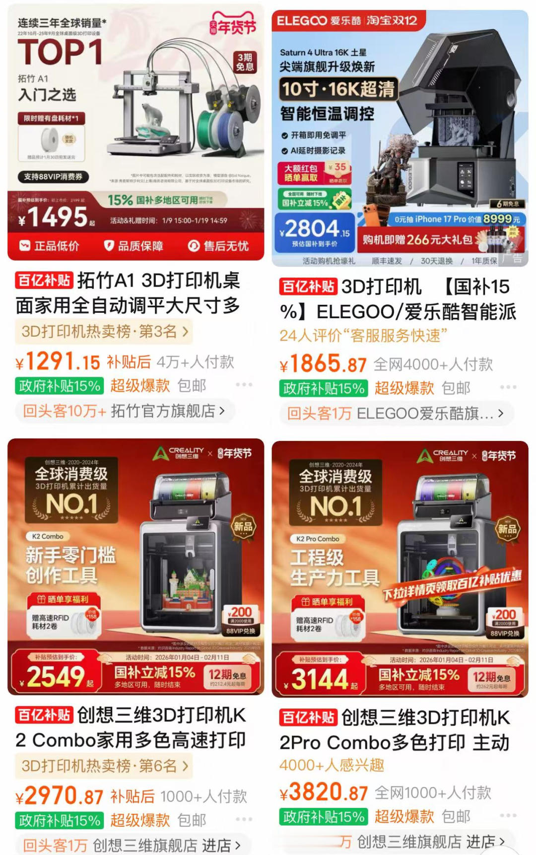 据媒体报道,25年双十一期间,京东和天猫两个网购平台的消费级3D打印机卖出了上万台,拓竹、创想三维等几大品牌的销售额同比增长超过80%;而消费级3D打印机的家庭用户占比,也从2023年的不足20%攀升到2025年的45%。