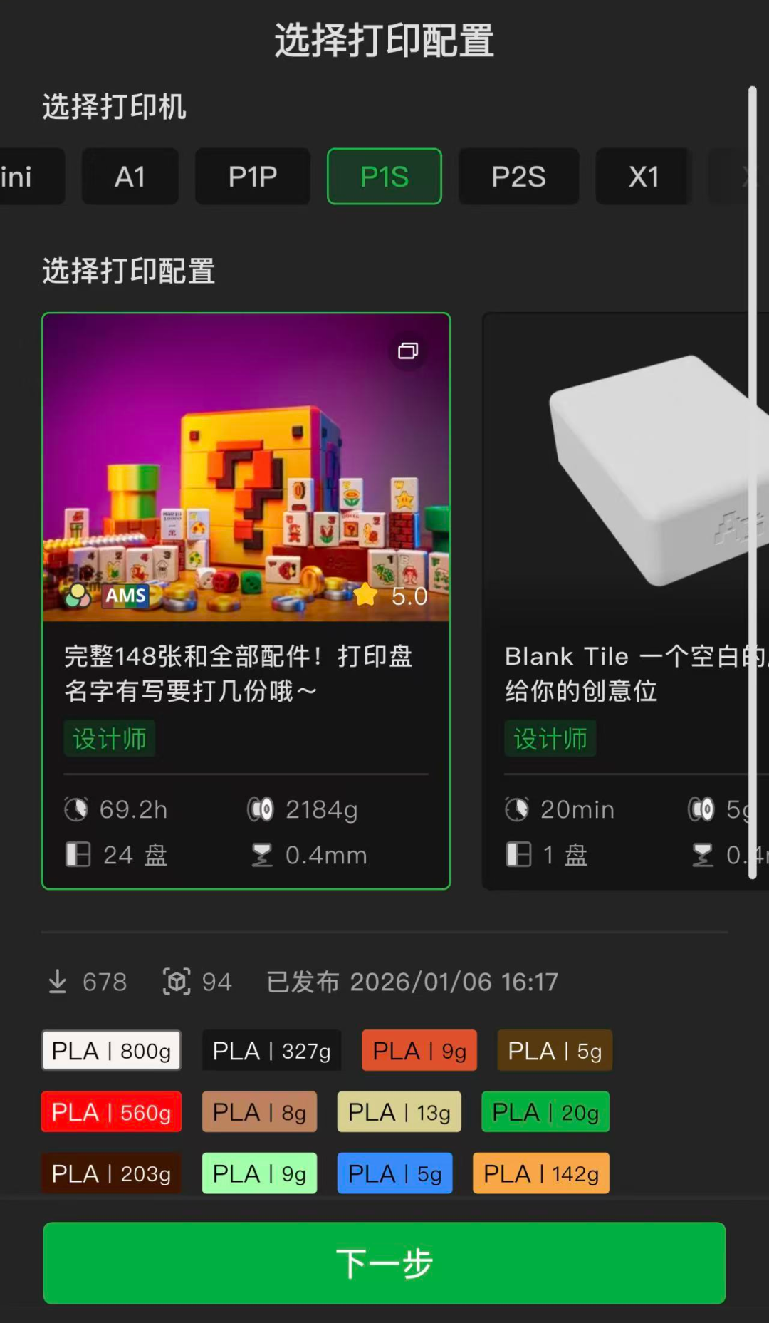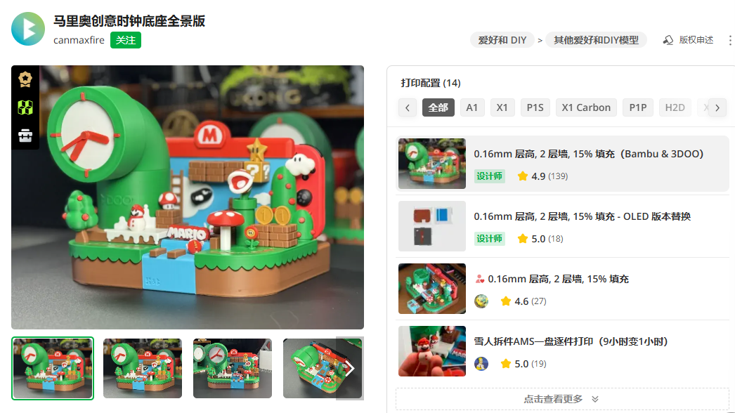 像最近的热门单品春联,打印一整套大致需要4-8小时;而一套建模更复杂的马里奥时钟Switch底座,更是需要72小时的打印时长。
