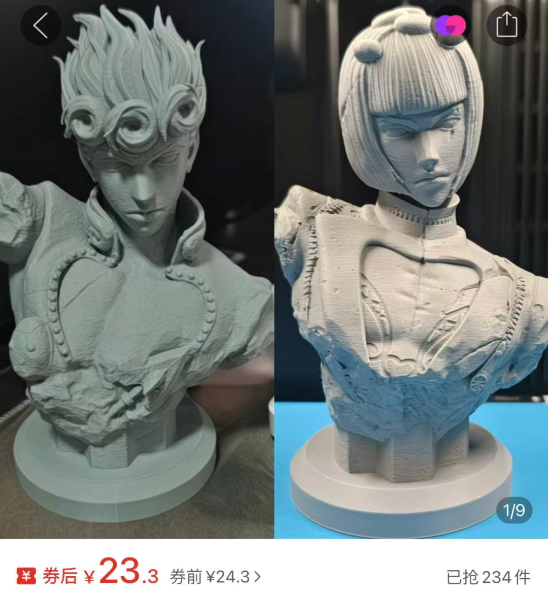 但便宜盗版手办的来源,其实不止“翻模”这一条路。不到10元的宝可梦小手办、不到30元的JOJO人物胸像……成本低、出品稳定的3D打印,构成了这片低价手办市场的另一极。