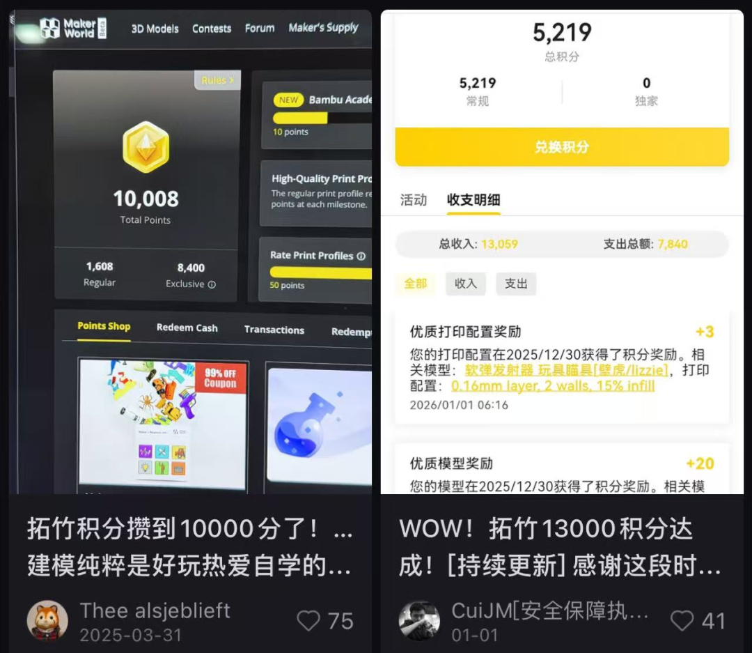 另外,各个3D打印机的开源社区,对于主动提供开源模型的创作者也会有相应的社区积分作为鼓励政策,而积分可以提现或兑换耗材的大额优惠券。
