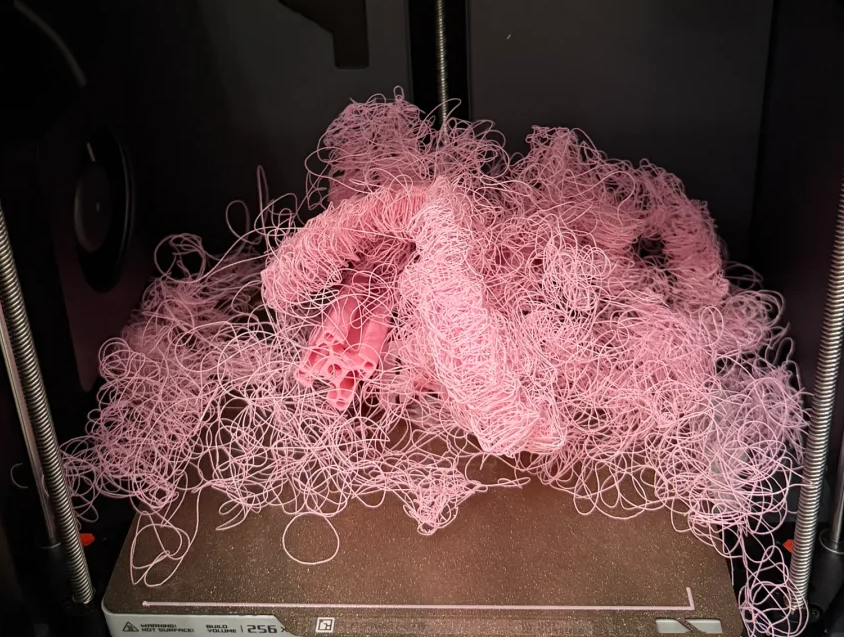 打印过程中也难免受其他因素影响,遇到令人有些焦躁的问题。最常见的,就是因为调平不到位,喷头离平台太高丝料落不下去,或者温度出错等,导致耗材像面条一样缠绕在喷头或者热床上的“炒面”现象。