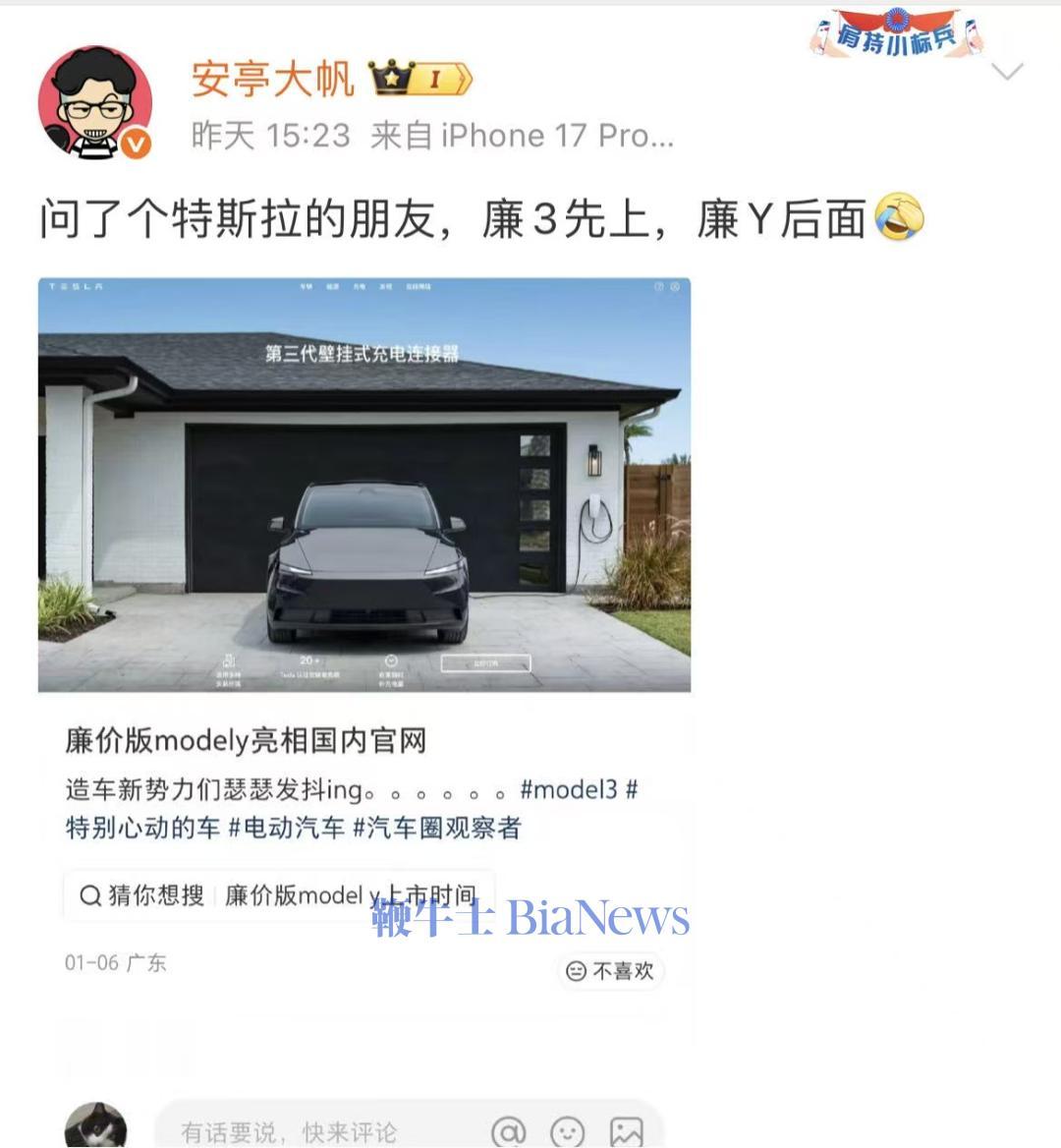 汽车博主“安亭大帆”透露,其已联系特斯拉工作人员,确认ModelY和Model3的廉价版本均计划登陆中国市场,其中Model3有望率先推出,ModelY随后跟进。