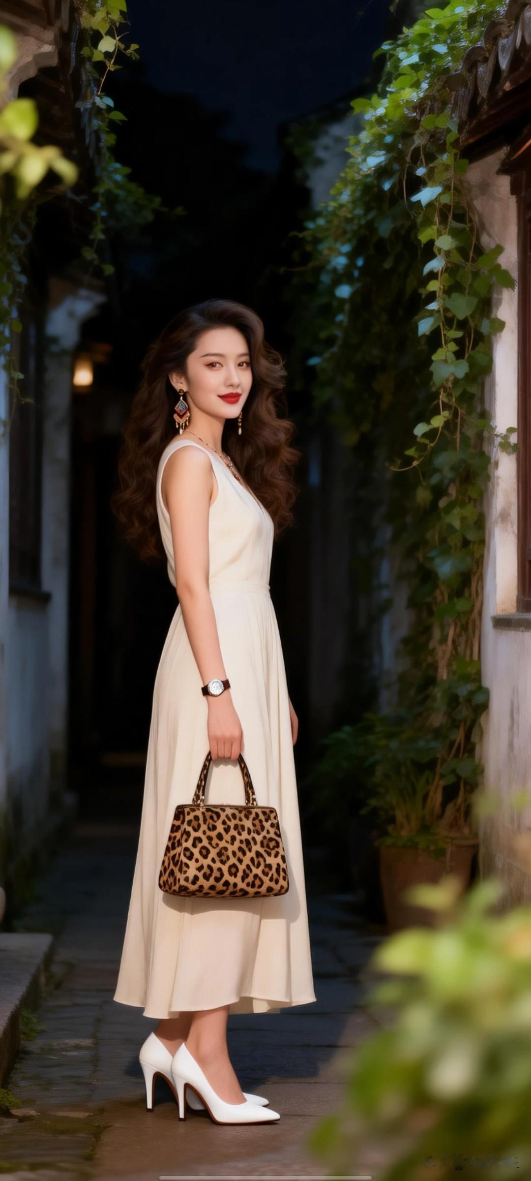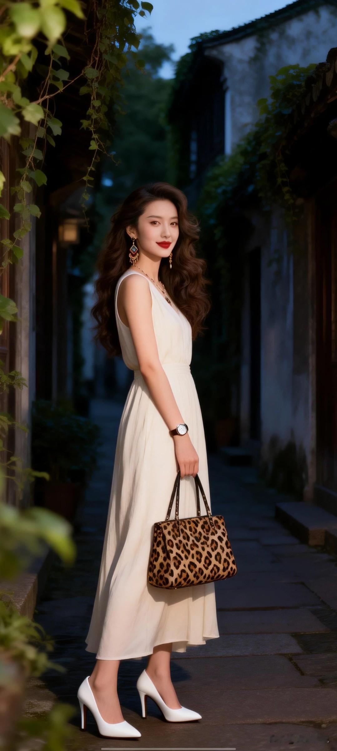 人像摄影,日常快照风格,非精心构图或打光,年轻气质美女,纯欲风,皮肤白皙,偶像气质,长直发,凸显纤细又完美的身材,双腿笔直修长,正面照,大上围,沙漏型身材,棕色长发(或茶色长发大波浪),身着米白色无袖长裙,白色15厘米高跟鞋搭配豹纹手提包与民族风耳饰,立于古镇小巷,姿态温婉,眼神明亮又带着一丝江南古镇的文艺感望向镜头。侧光让服饰的质感与古镇的历史肌理交融,背景是爬满绿植的古巷建筑,镜头聚焦她的姿态与穿搭细节,整体画面充满“江南古镇里的文艺旅者”感,动作轻柔,黑暗环境,情绪写意,专业模特神情,表情细腻且自然,情脉脉的眼神盯着镜头,情绪氛围感,32K高清画质,32K细腻真人皮肤纹理,前景虚化,背景虚化。