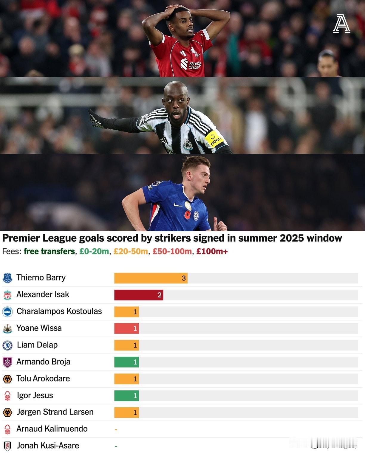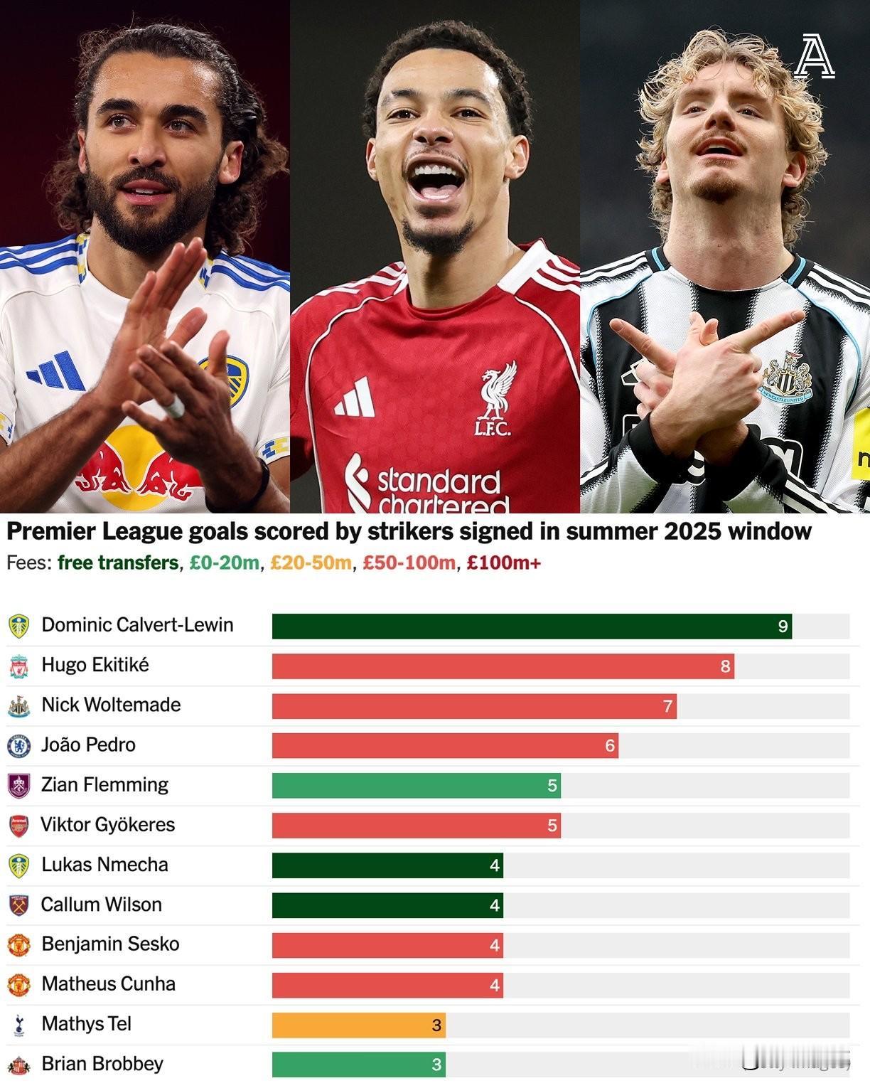 英超俱乐部在去年夏天转会窗口对中锋位置的投入依旧活跃。 据《The Athletic》统计,本赛季20家顶级联赛俱乐部在此期间共引进了23名一线队前锋。 其中20人为付费转会,总费用估计达到8.12亿英镑(约11亿美元)——平均每位签约球员花费4100万英镑。 这些投入是否物有所值? 现在给出确定性答案还为时过早,但基于半个赛季的表现数据,却能发现一些有趣的现象。如下图,高价≠高效,反而是中价、低价引援的实战更价值值得关注。
